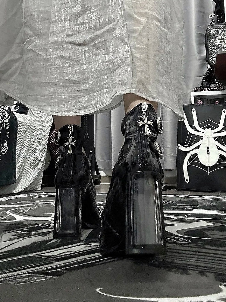 ポリッシュ仕上げのブラックゴシッククロコダイルバックルストラップハイブロックヒール
