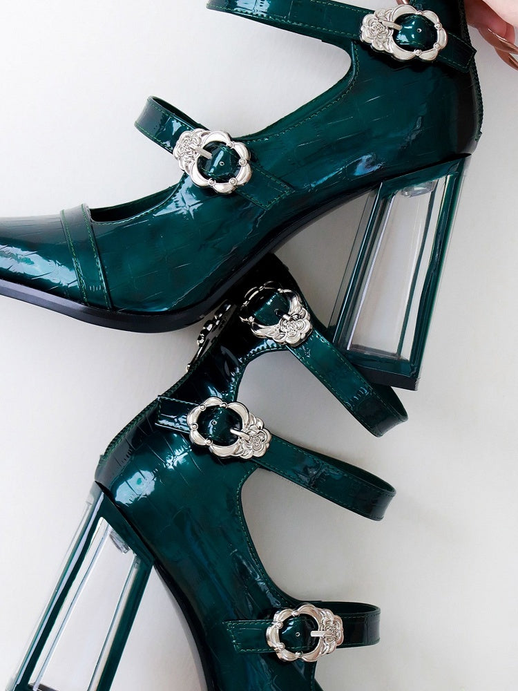 光沢のあるグリーンのゴシッククロコダイルバックルストラップハイブロックヒール