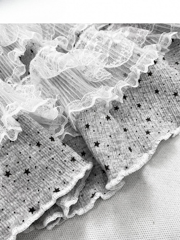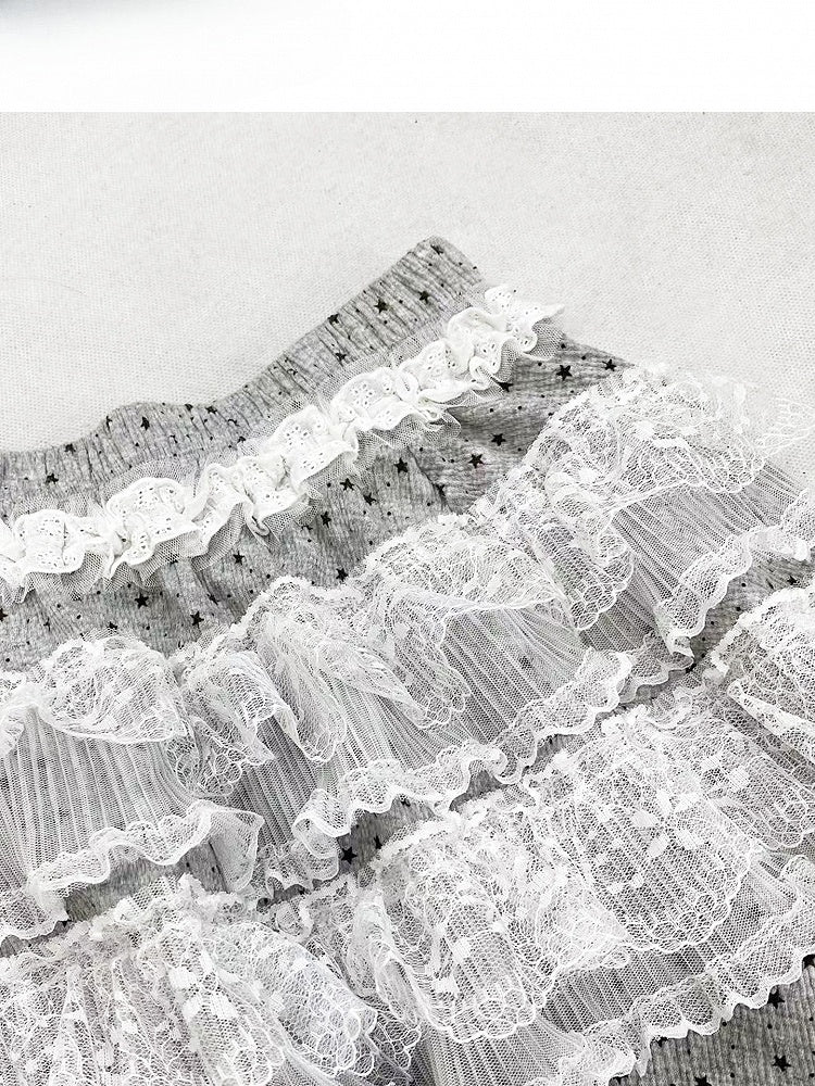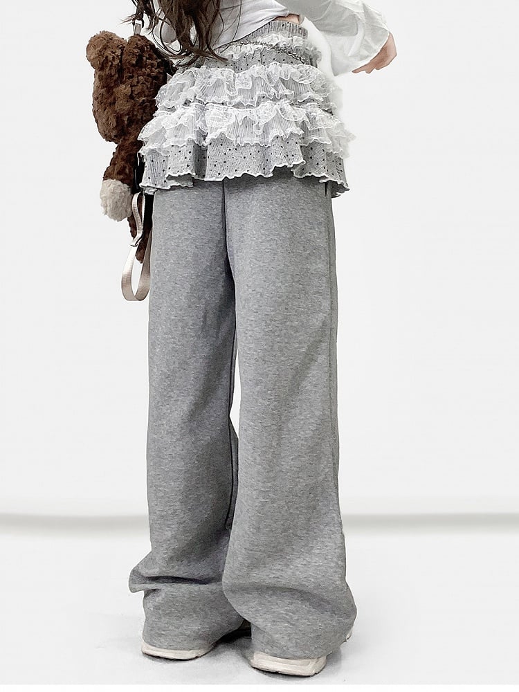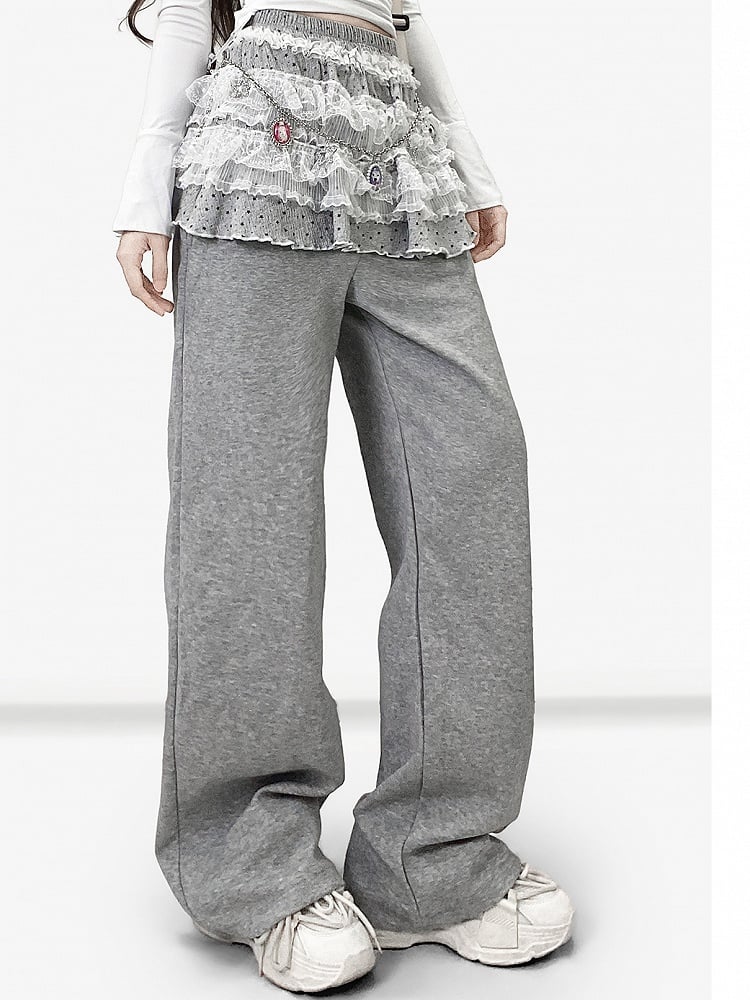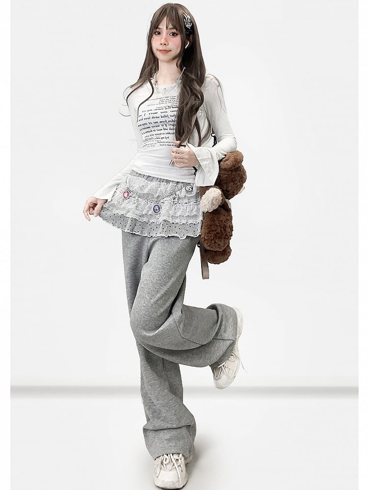 グレーのY2Kビタースイートワイドレッグカットパンツ+水玉模様のレーストリムティアードスカート
