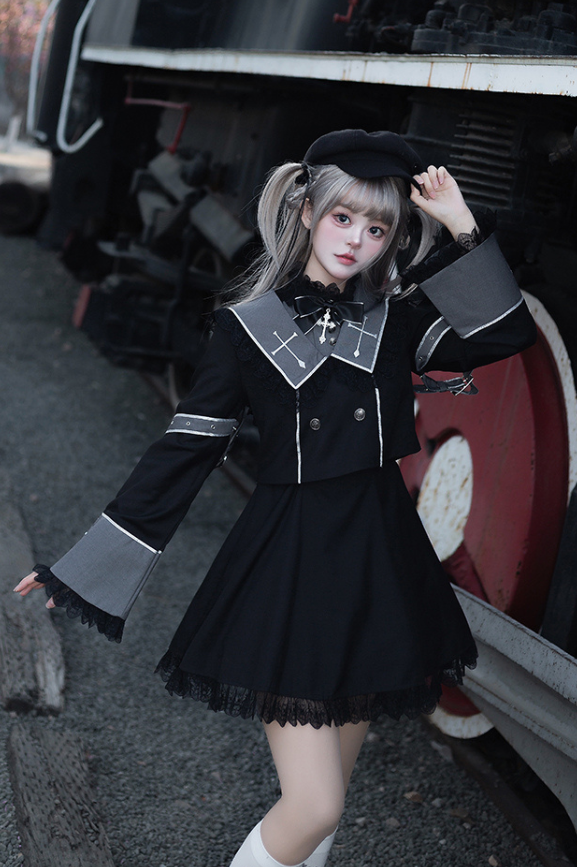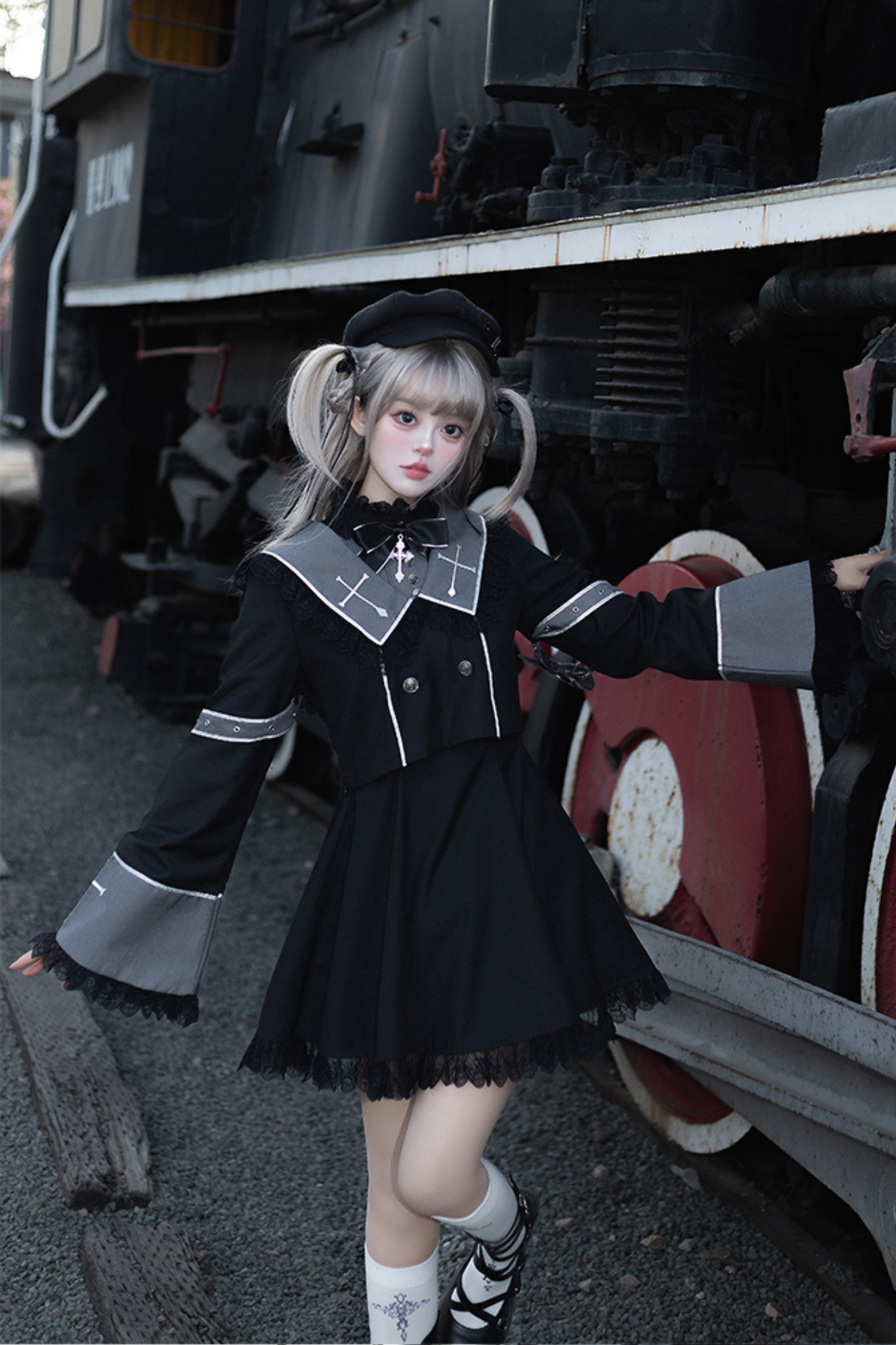 黒と白のオールドスクールロリータファッションドレス蝶結びロリータJSKセット
