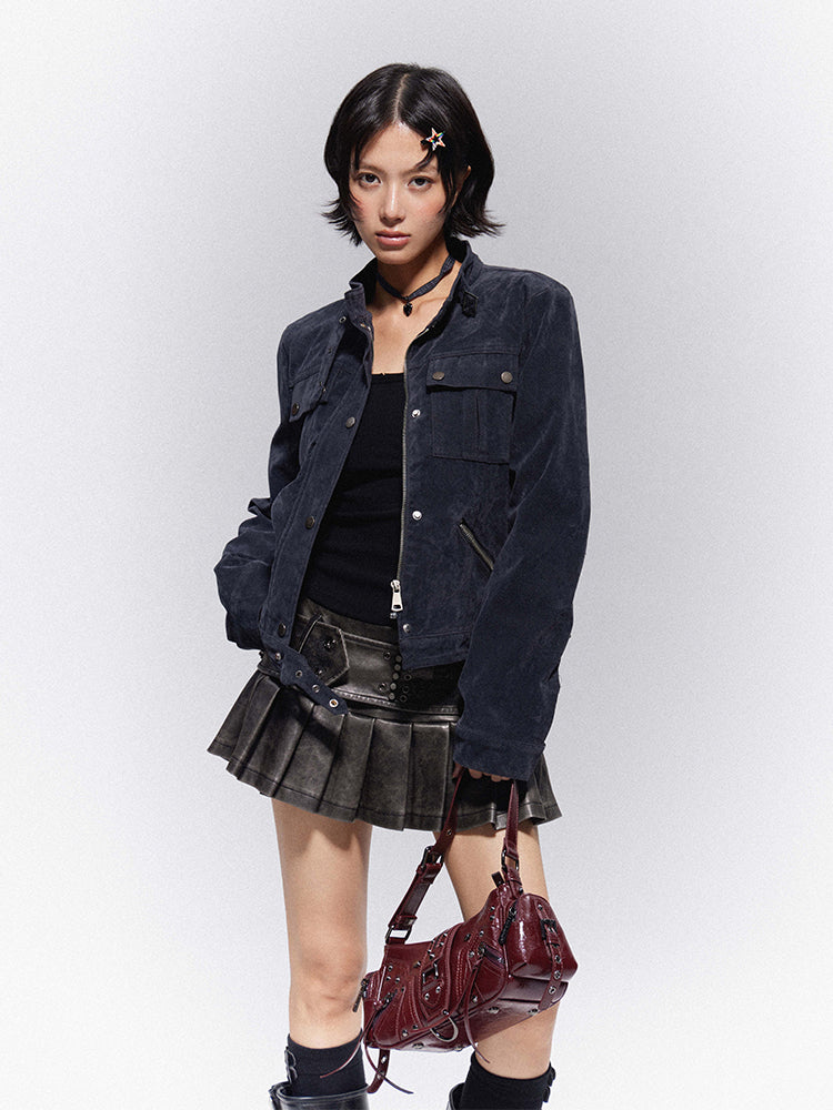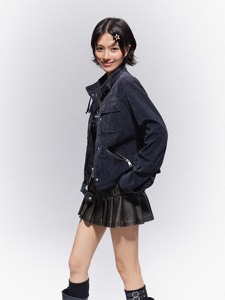 Black Punk PU Pleated Mini Skirt with Floral Embroidered Snap-Button Belt