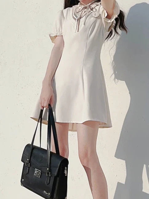 パフエンブレムVネックスタイルドレスシャツ+バッジプレッピーリボン+袖フリル