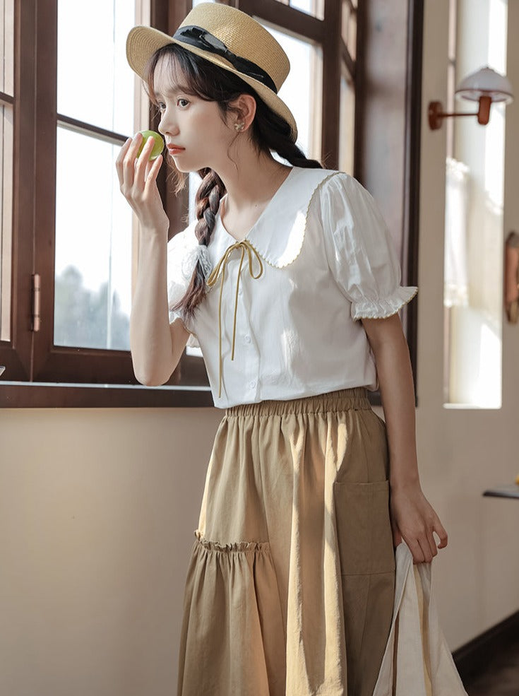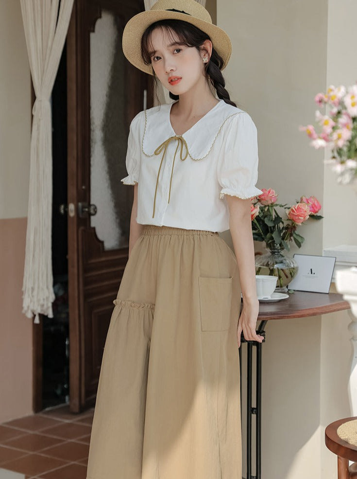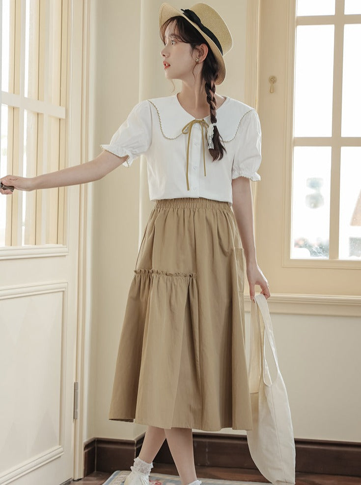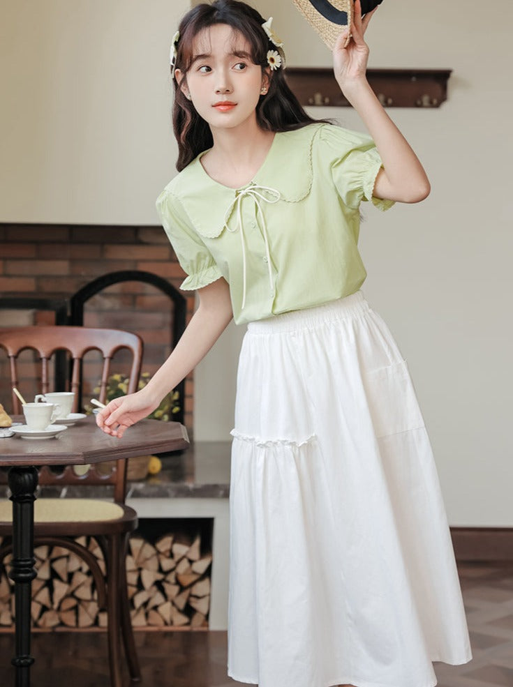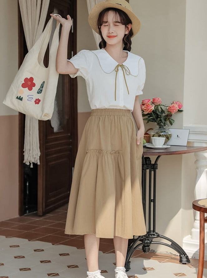 パフスリーブスカートフレアサマーシャツ+レトロミディアム