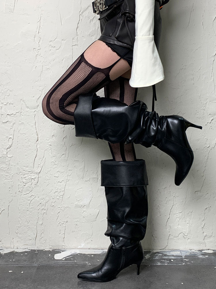 パンクなブラックストライプカットアウトサスペンダータイツ