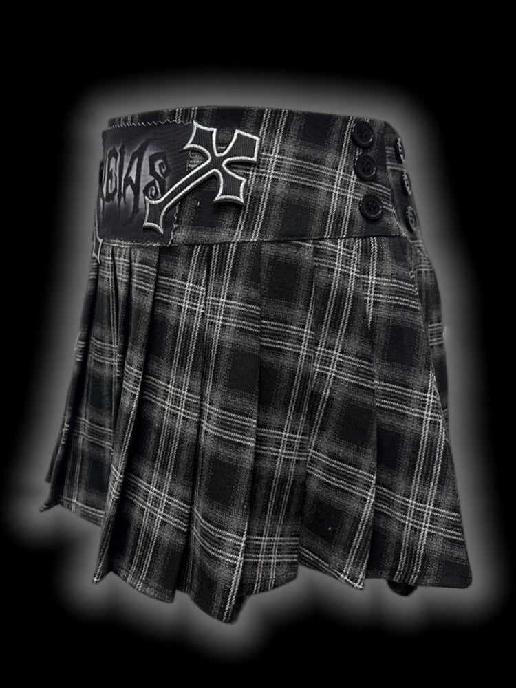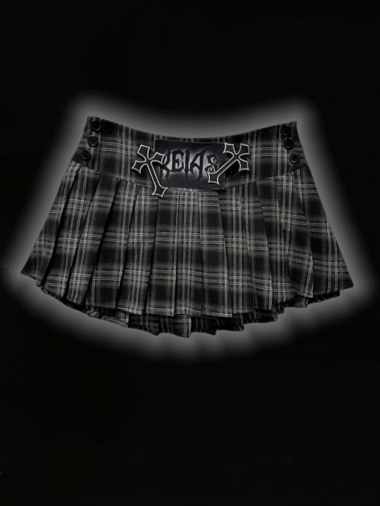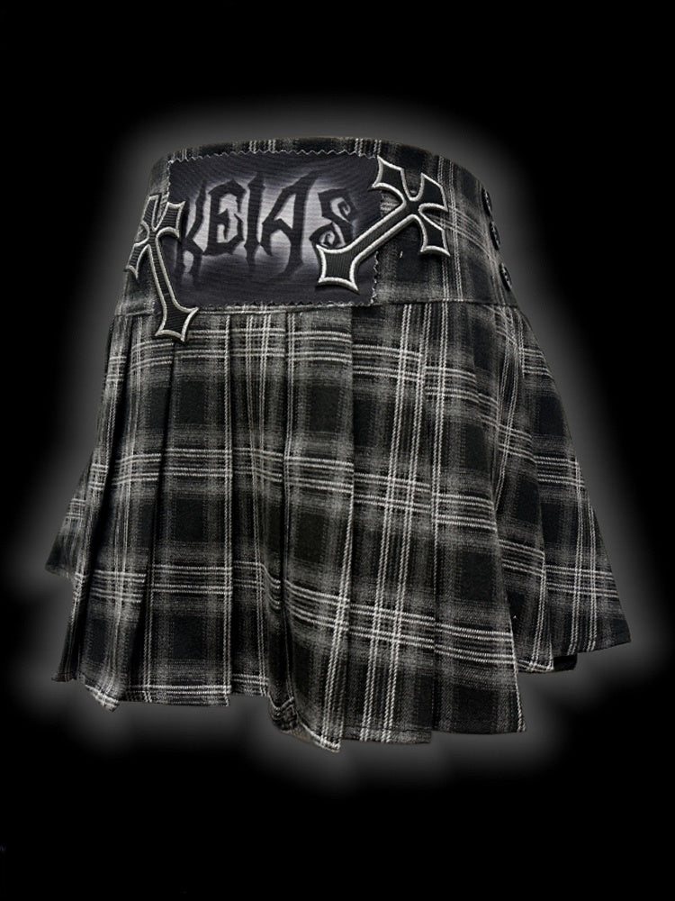 パンクグレーのクロスアップリケ付きローウエストチェック柄プリーツミニスカート(フリーウエストチェーン付き)