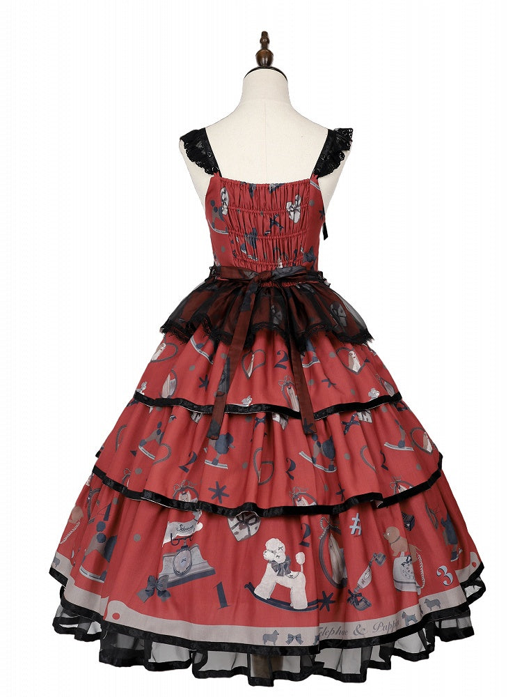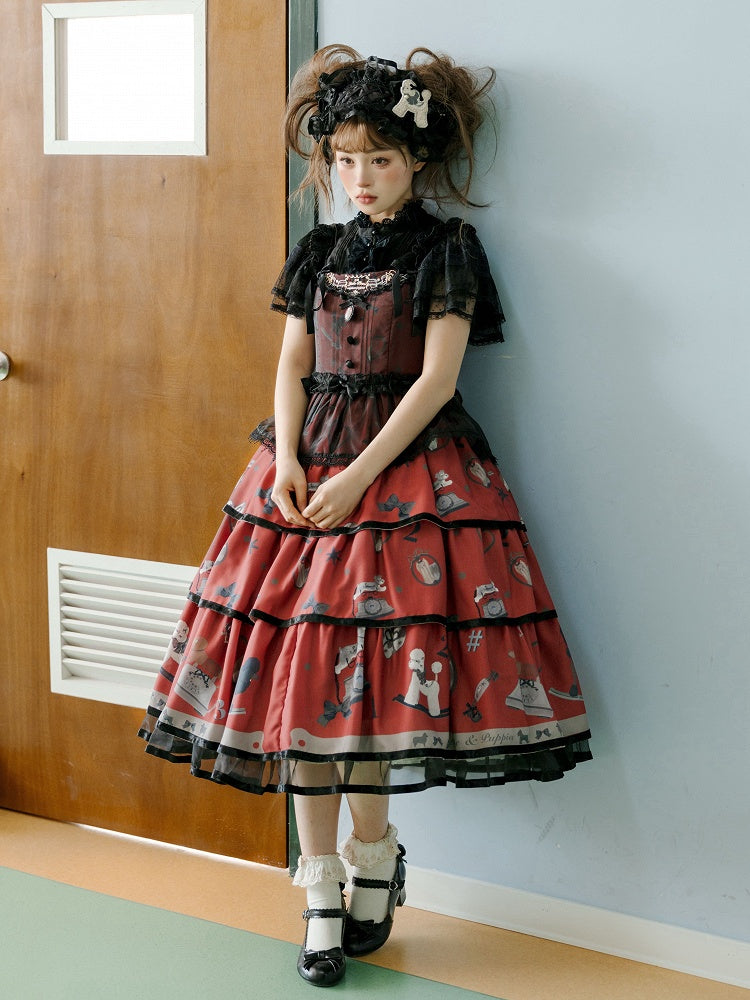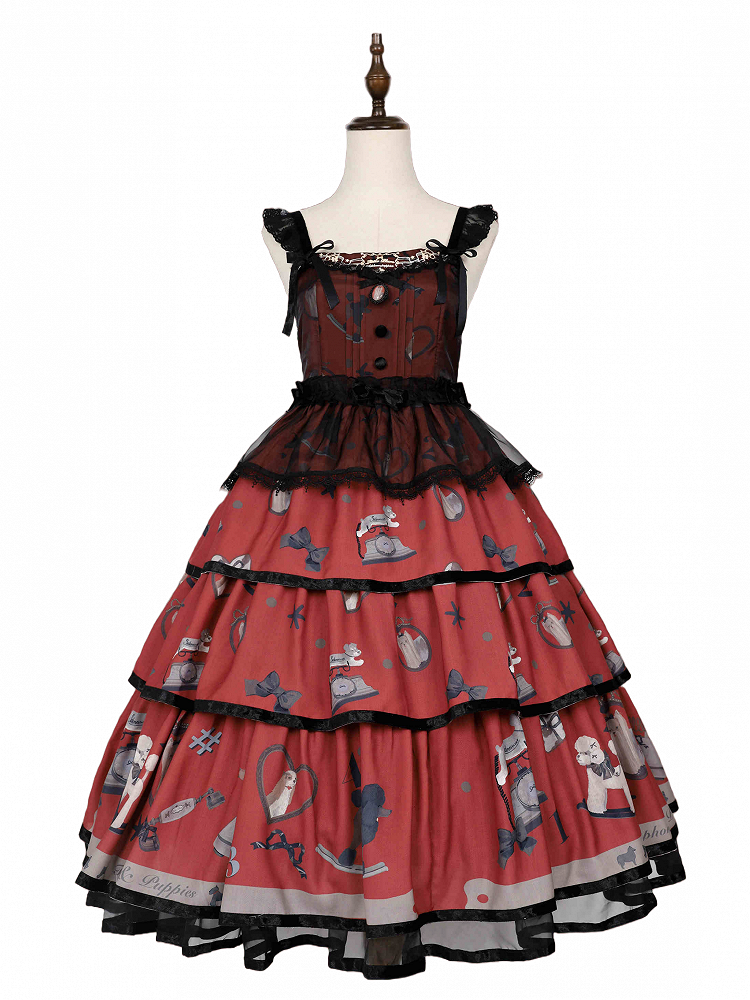 遊び心のある子犬と電話のプリントがキュートなティアードスカート。スイートロリータファッションにぴったりです。黒と赤のコントラストが、このジャンパースカートに魅力を添えています。どんなチャーミングで愛らしいルックにもぴったりです。