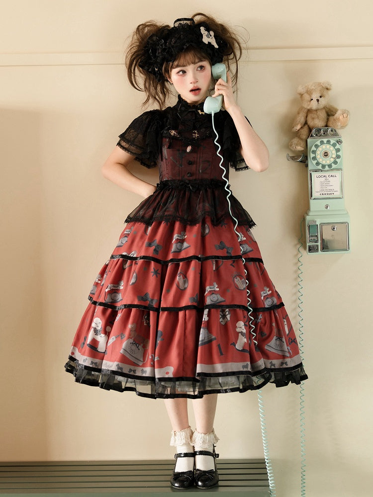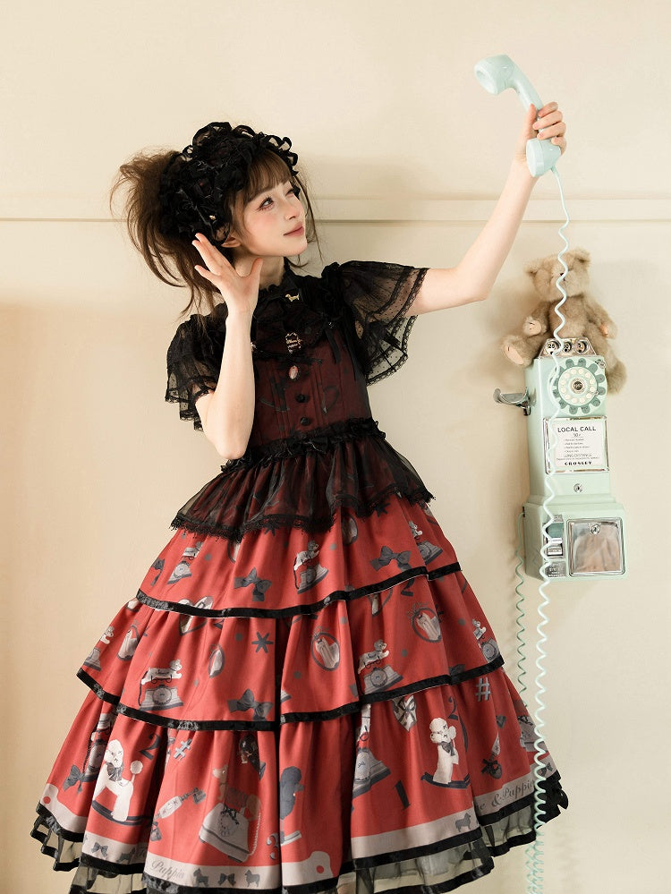子犬と電話のプリントのティアードスカート ブラックとレッドのスイートロリータジャンパースカート