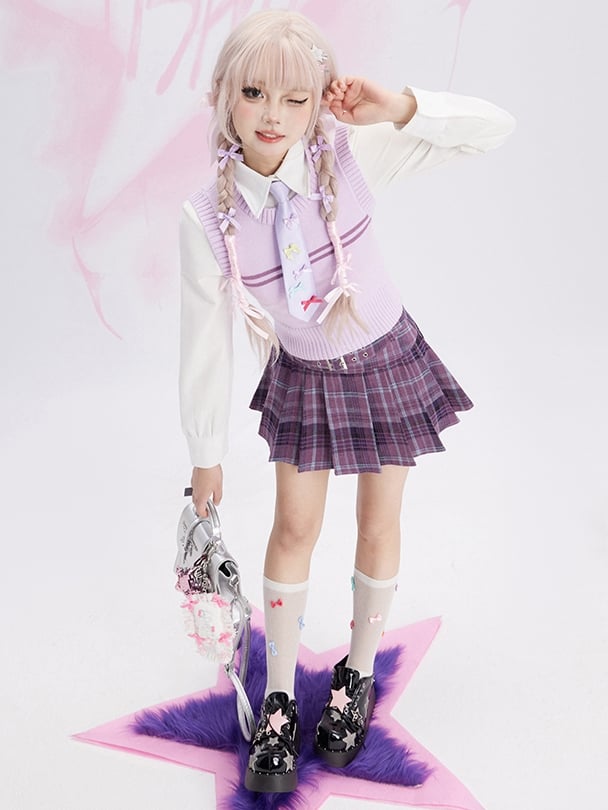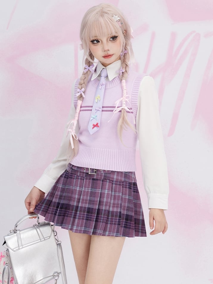 パープルバックルストラップのプレッピースタイルチェック柄プリーツスカート