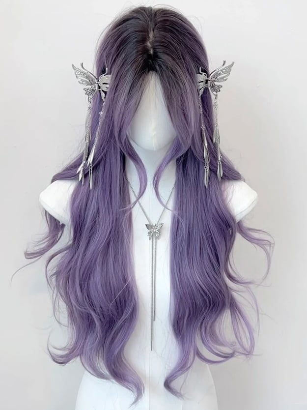 紫色のウエスト丈ウェーブ合成ウィッグ(前髪付き)