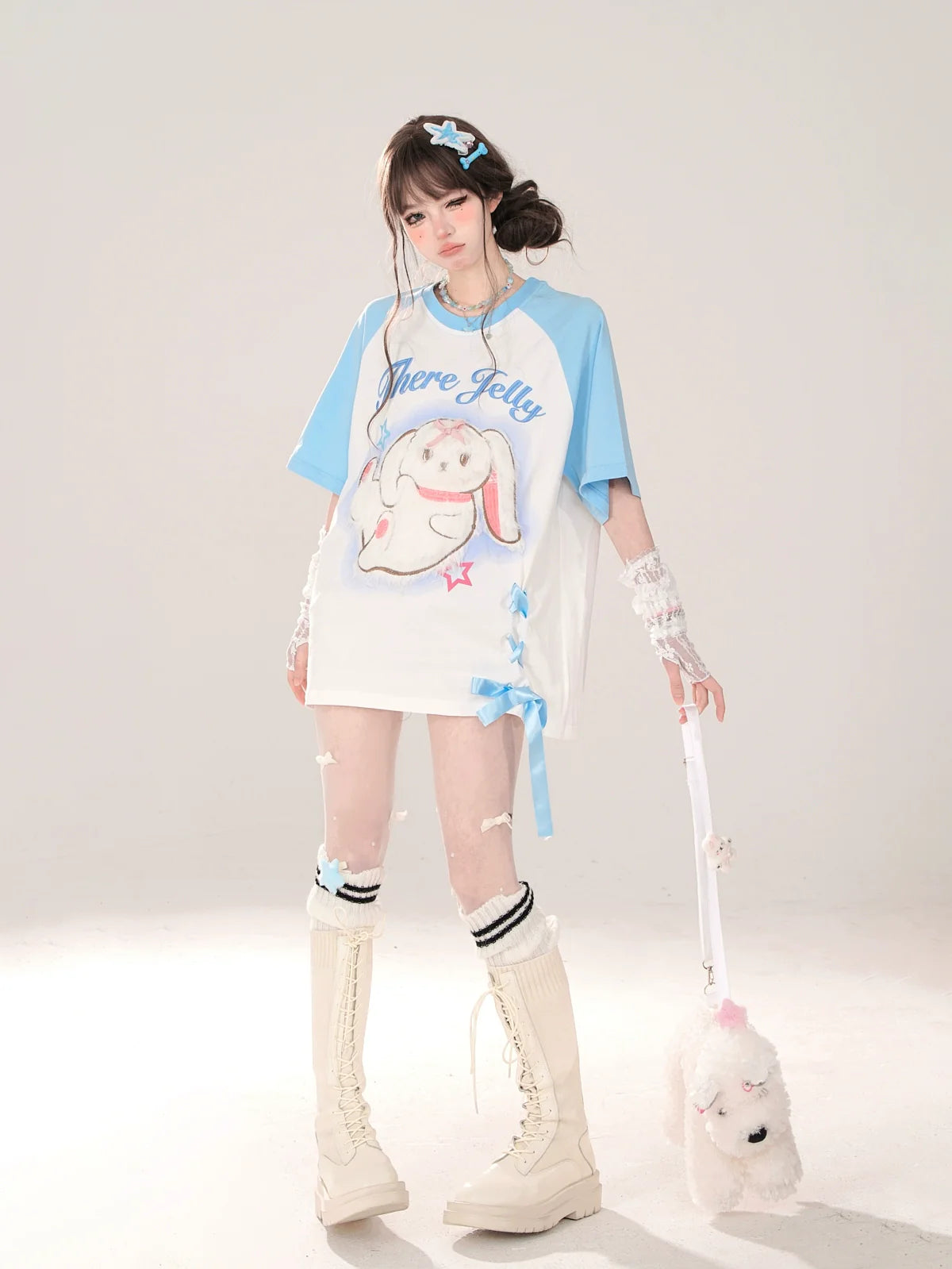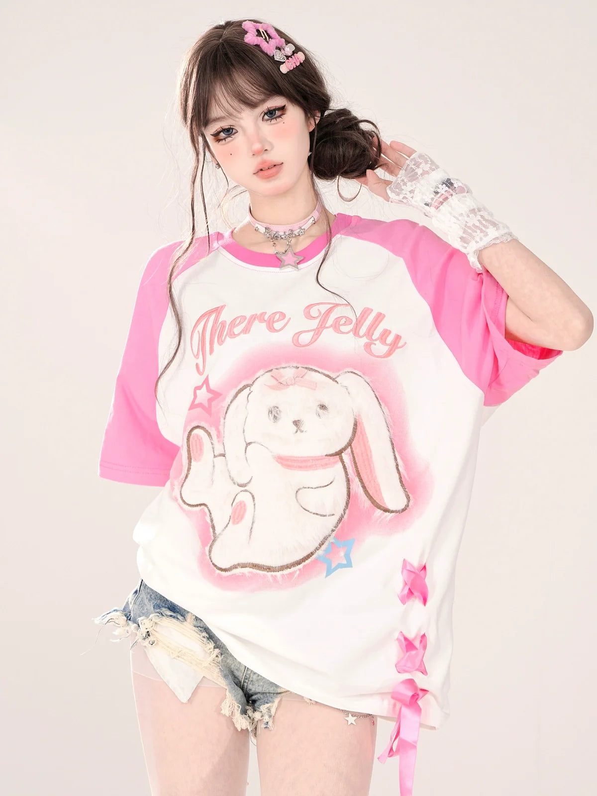 ラグランTシャツ ピンク ブルー ルーズ ウサギとデザイン