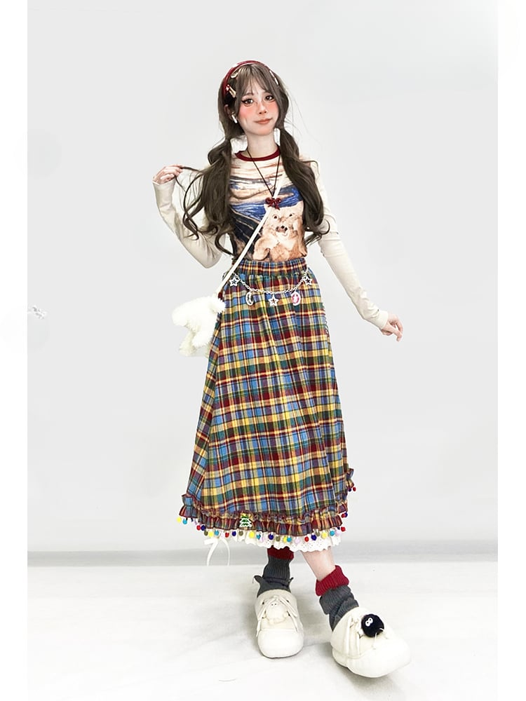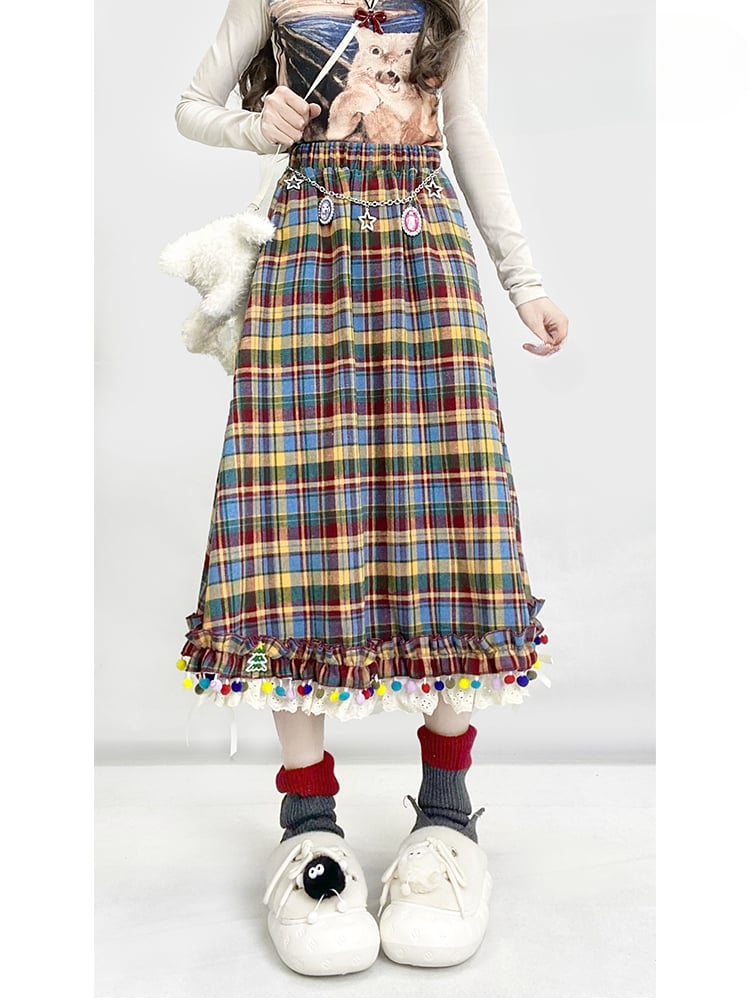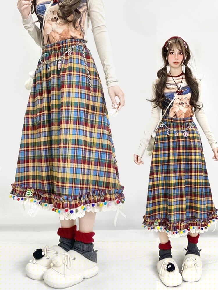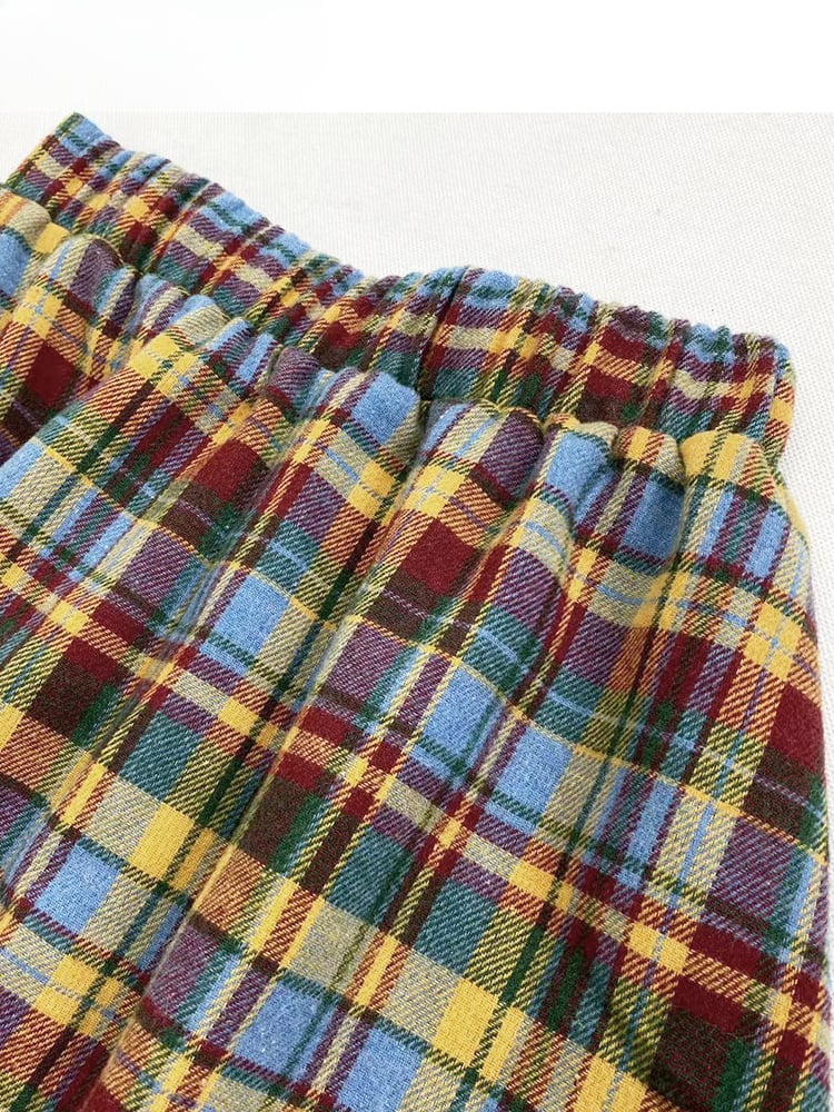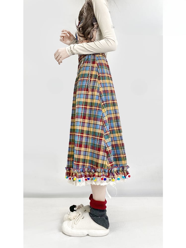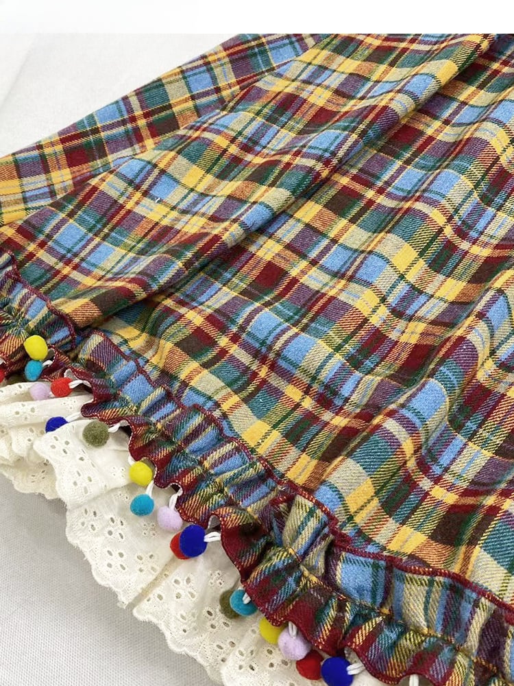 レインボーチェック柄ポンポン裾ミディ丈ヴィンテージスカート