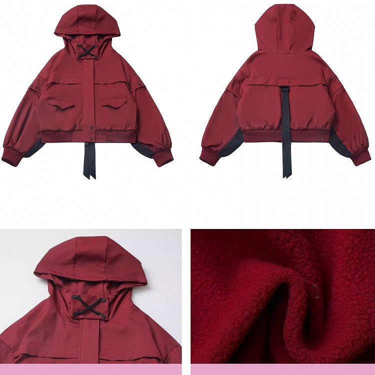 愛らしいフード付きクロップドジャケットは、ユニークな赤と黒のカラーブロックデザインが特徴で、ワードローブにエッジを効かせたい時にぴったりです。クロップド丈がスタイルを美しく見せ、フードが温かみをプラス。このステートメントピースで、あなたのファッショナブルな一面をアピールしましょう。