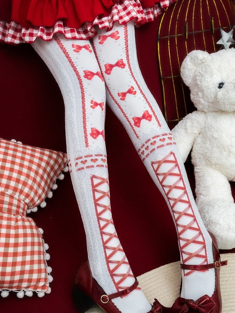赤/黒のスイートロリータ蝶結びハートプリントタイツ