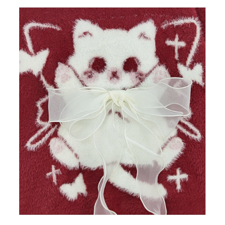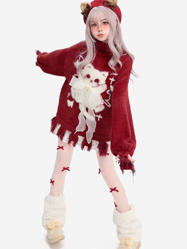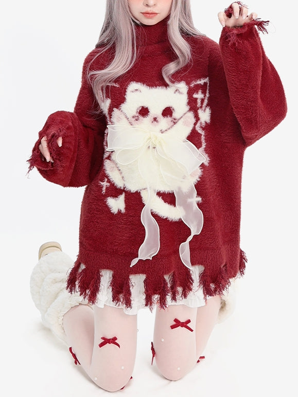 赤い猫柄のリボンアクセント、ディストレストリムのハイネック、着心地の良いセーター