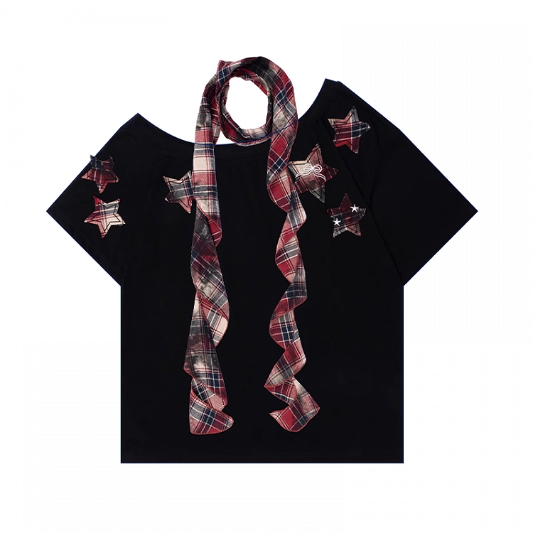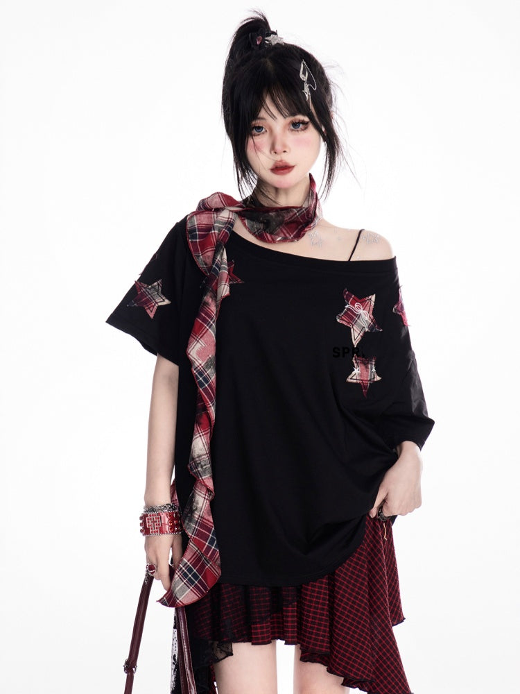 赤いチェック柄の星のアップリケと黒のアシンメトリーネックラインのTシャツ(無料スカーフ付き)