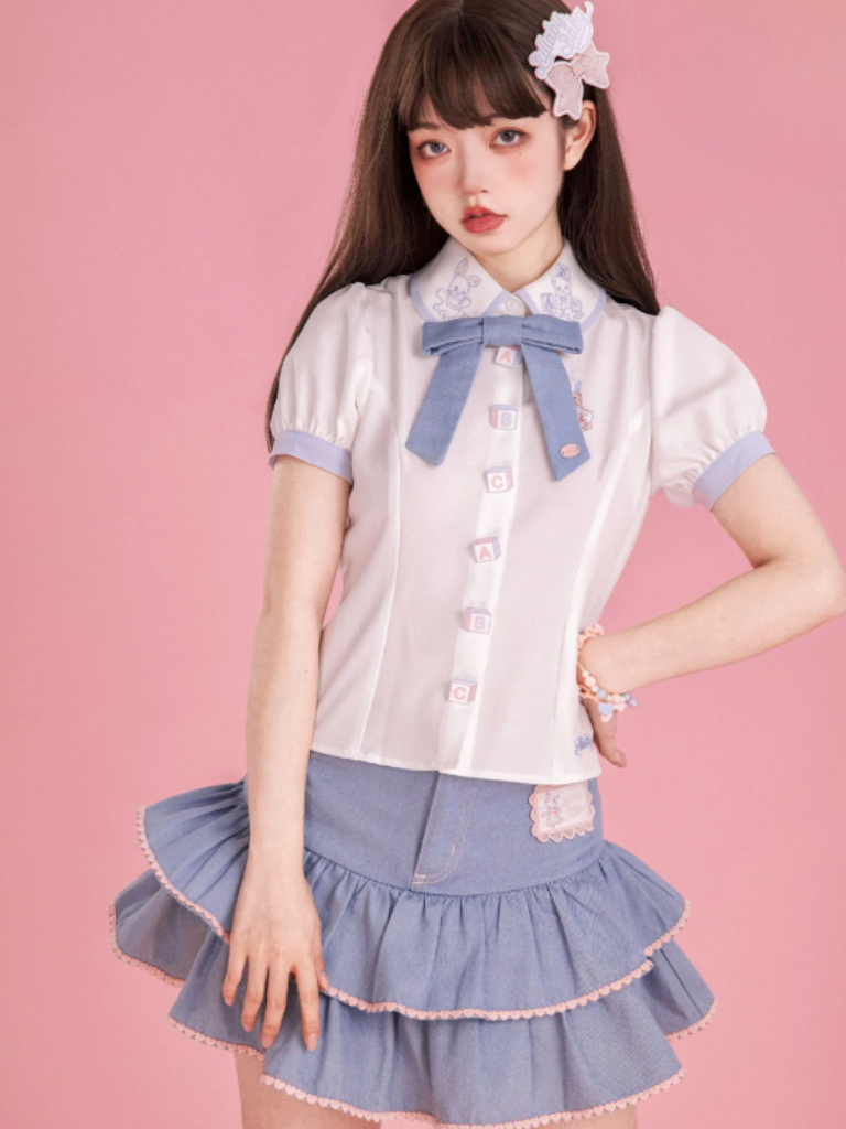 青と白のオールドスクールロリータファッションドレス 蝶結びディテール JSK セット