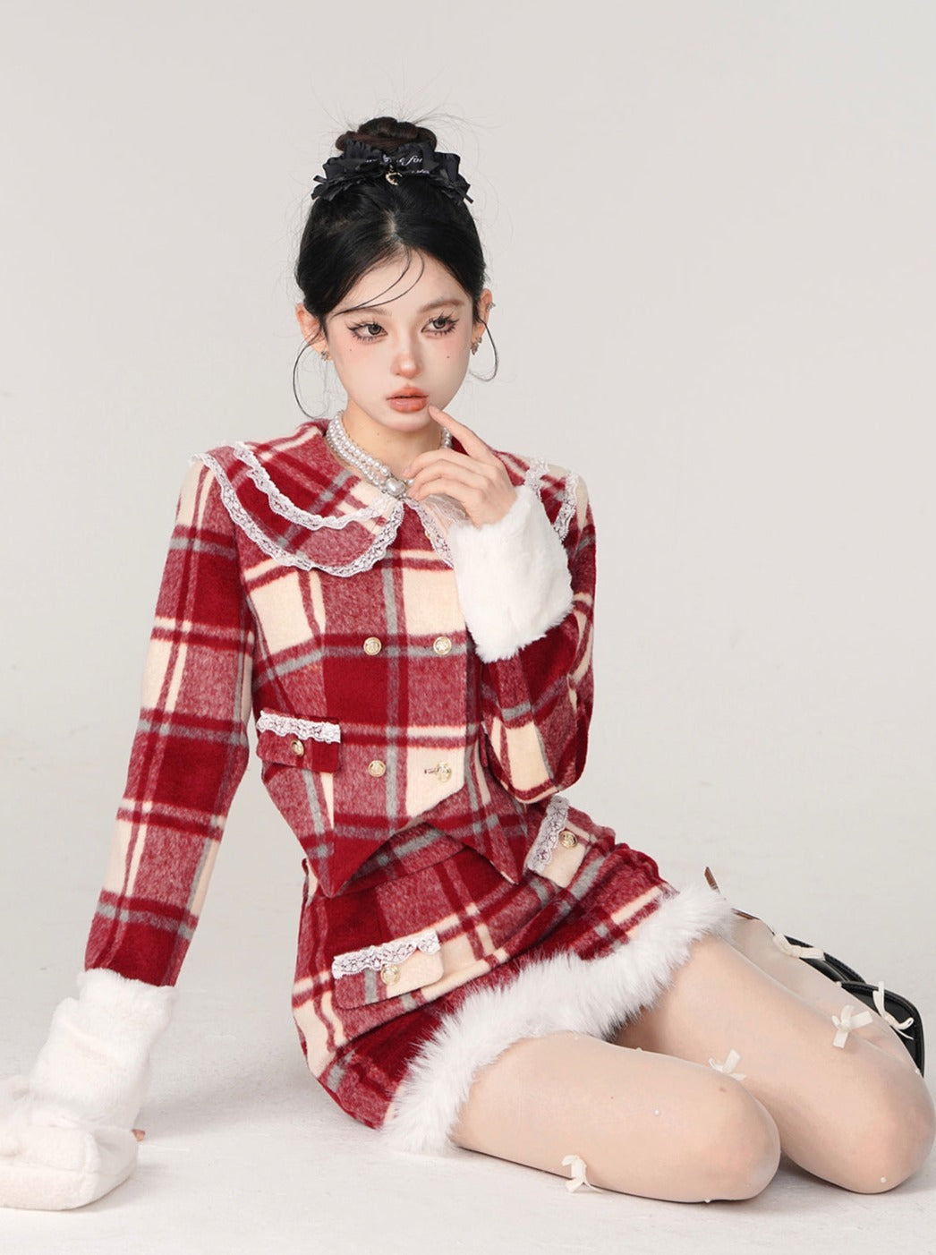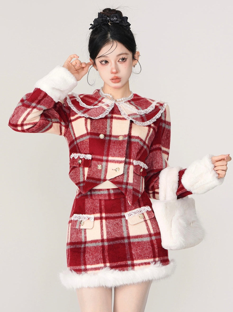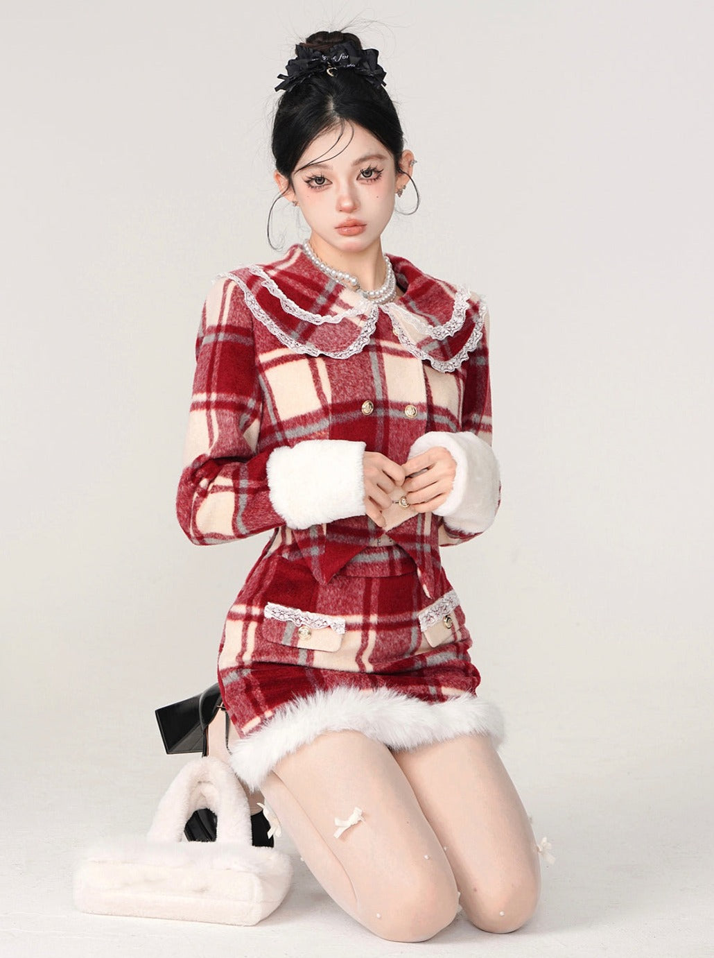 レトロフレンチレースカラーチェックジャケット+ファーチェックダブルスカート