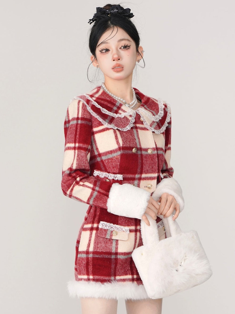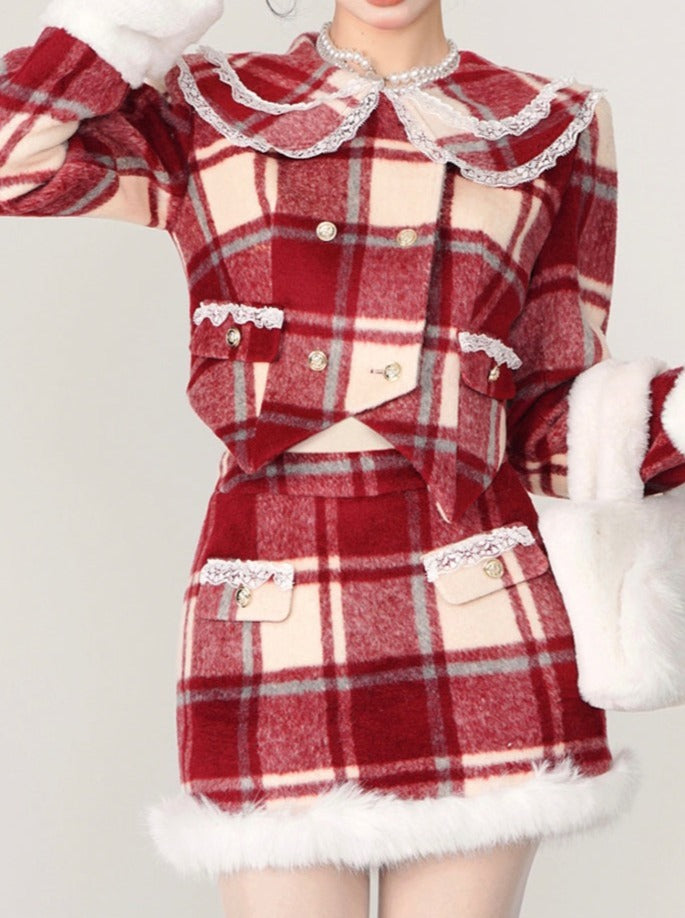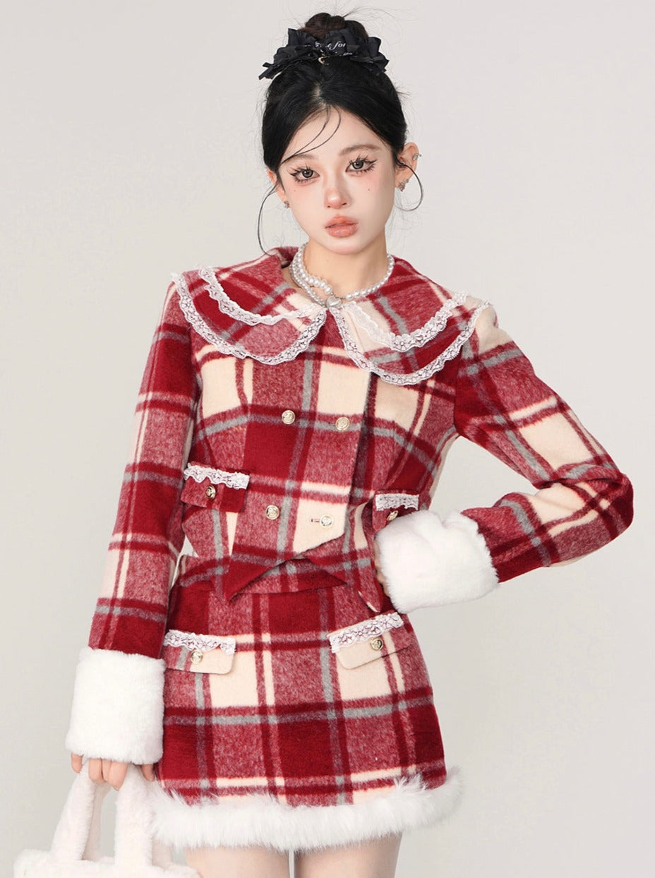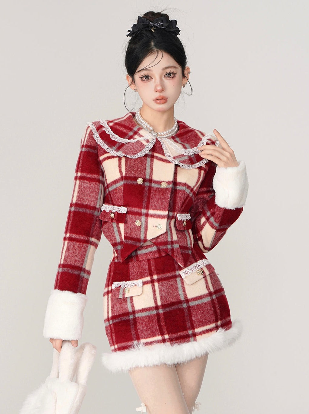 レトロフレンチレースカラーチェックジャケット+ファーチェックダブルスカート
