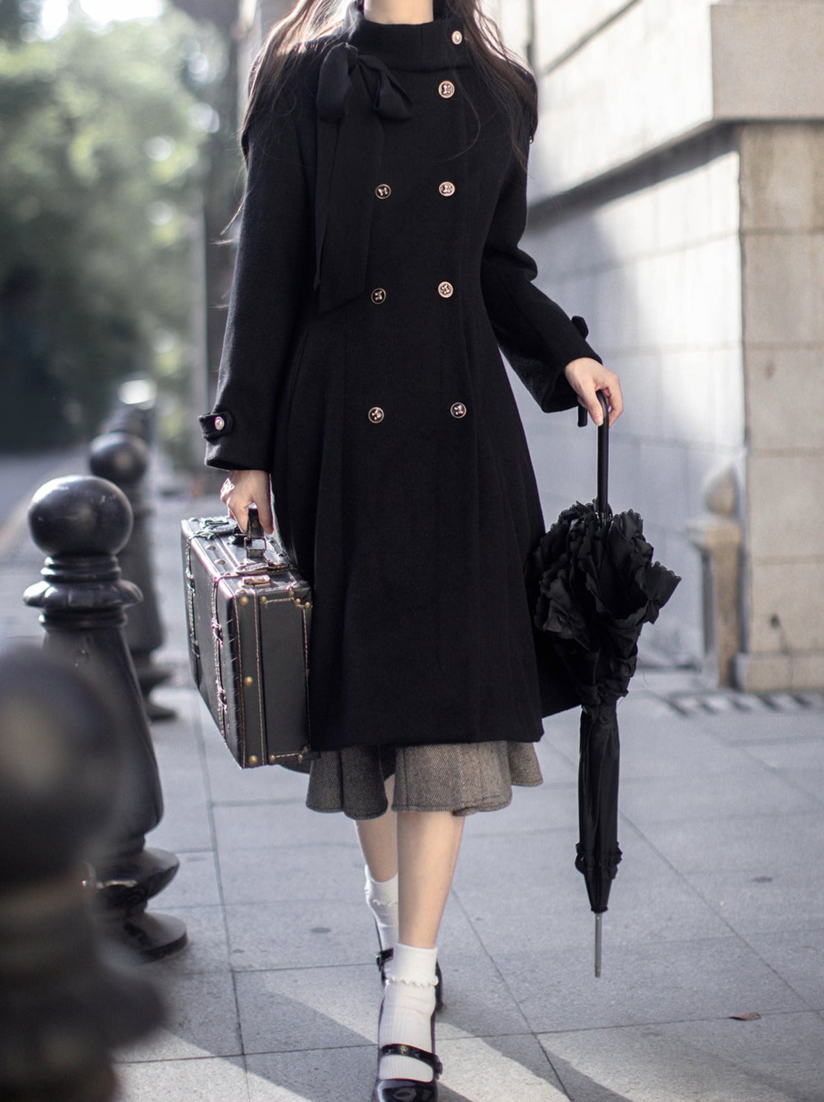 レトロなウールのダブルカラー+エレガントなブレストリボンコートスタンド