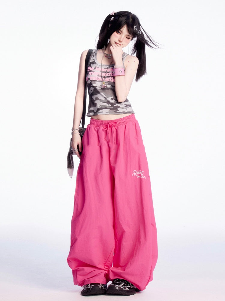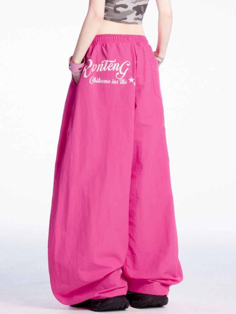 ローズレッドのドローストリングウエストとカフスのワイドレッグカジュアルパンツ