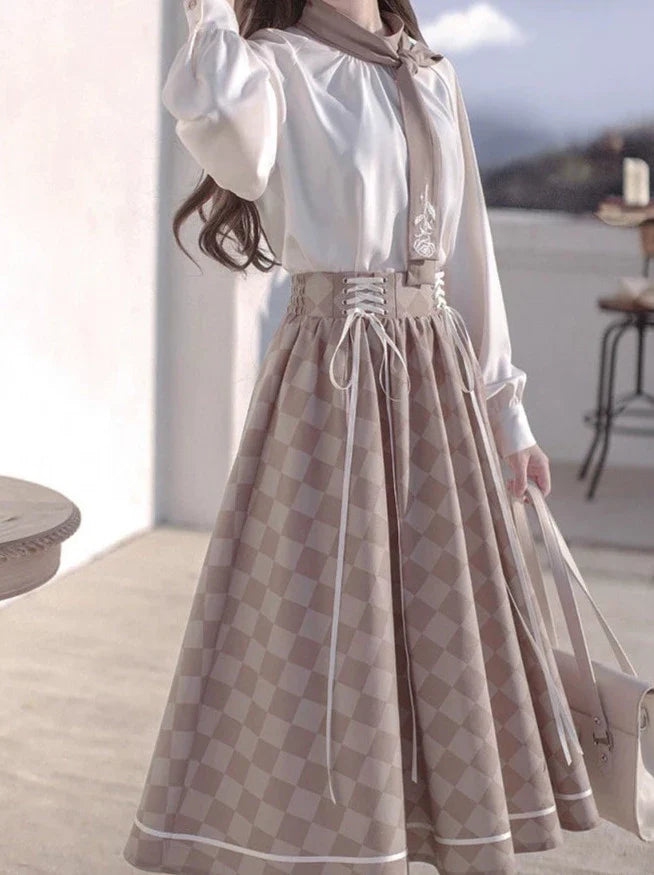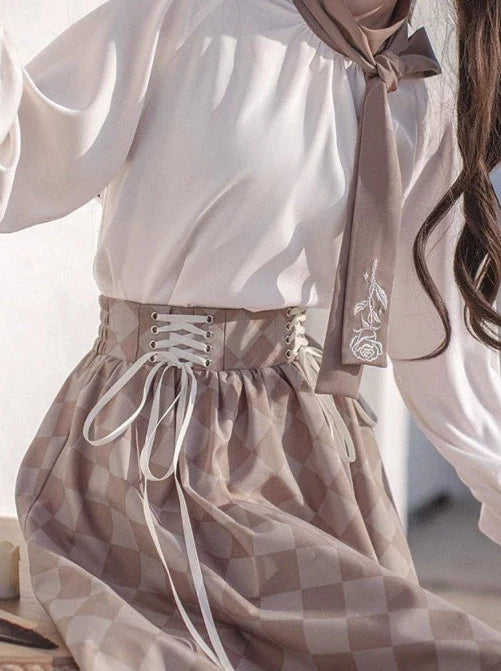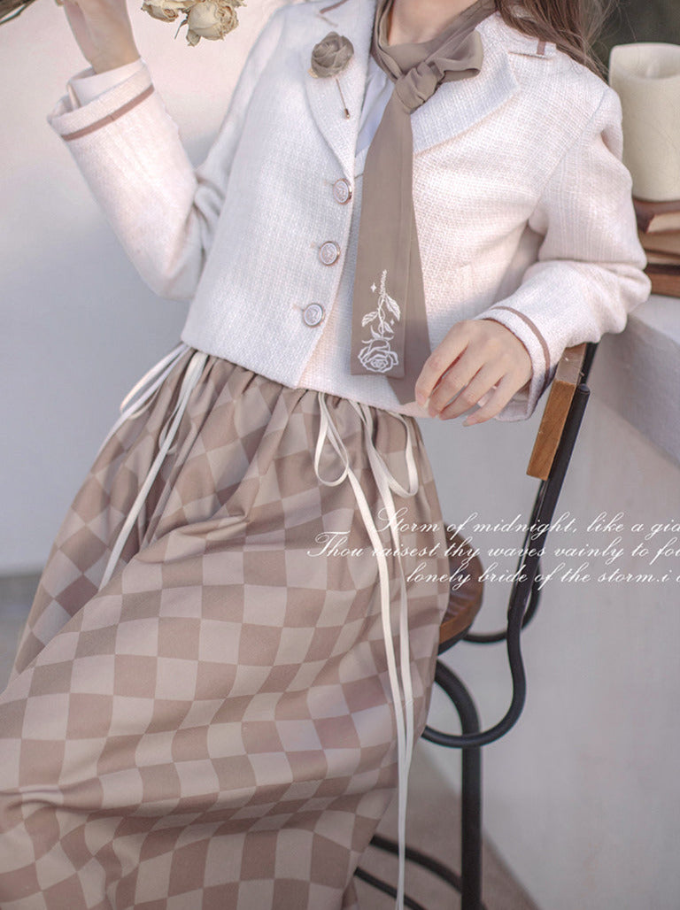 ローズスカート レトロ + ブローチ ジャケット ボウシャツ ネクタイ フレンチチェック ショートスーツ レースアップ