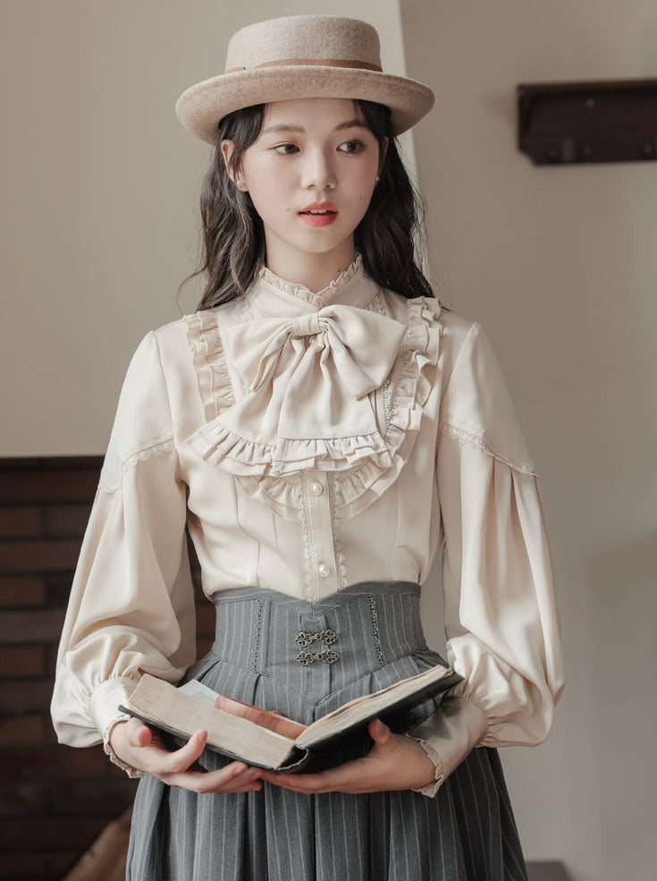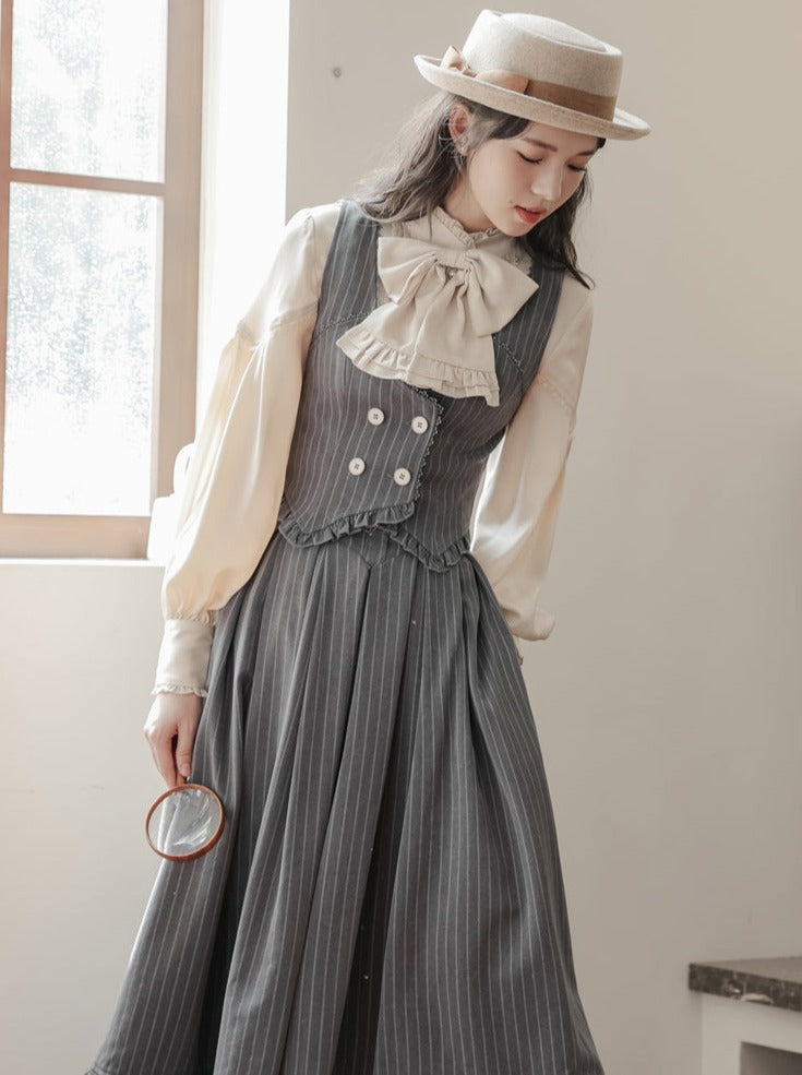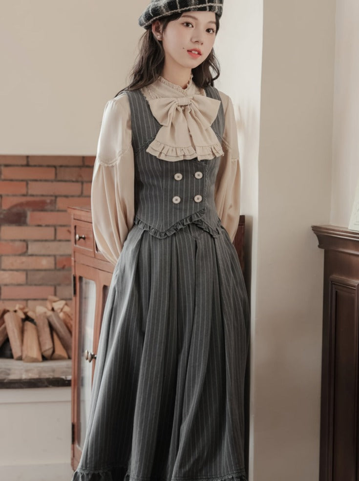 フリル+ブラウス ストライプカラー+スカート フレアレトロベスト ダーク