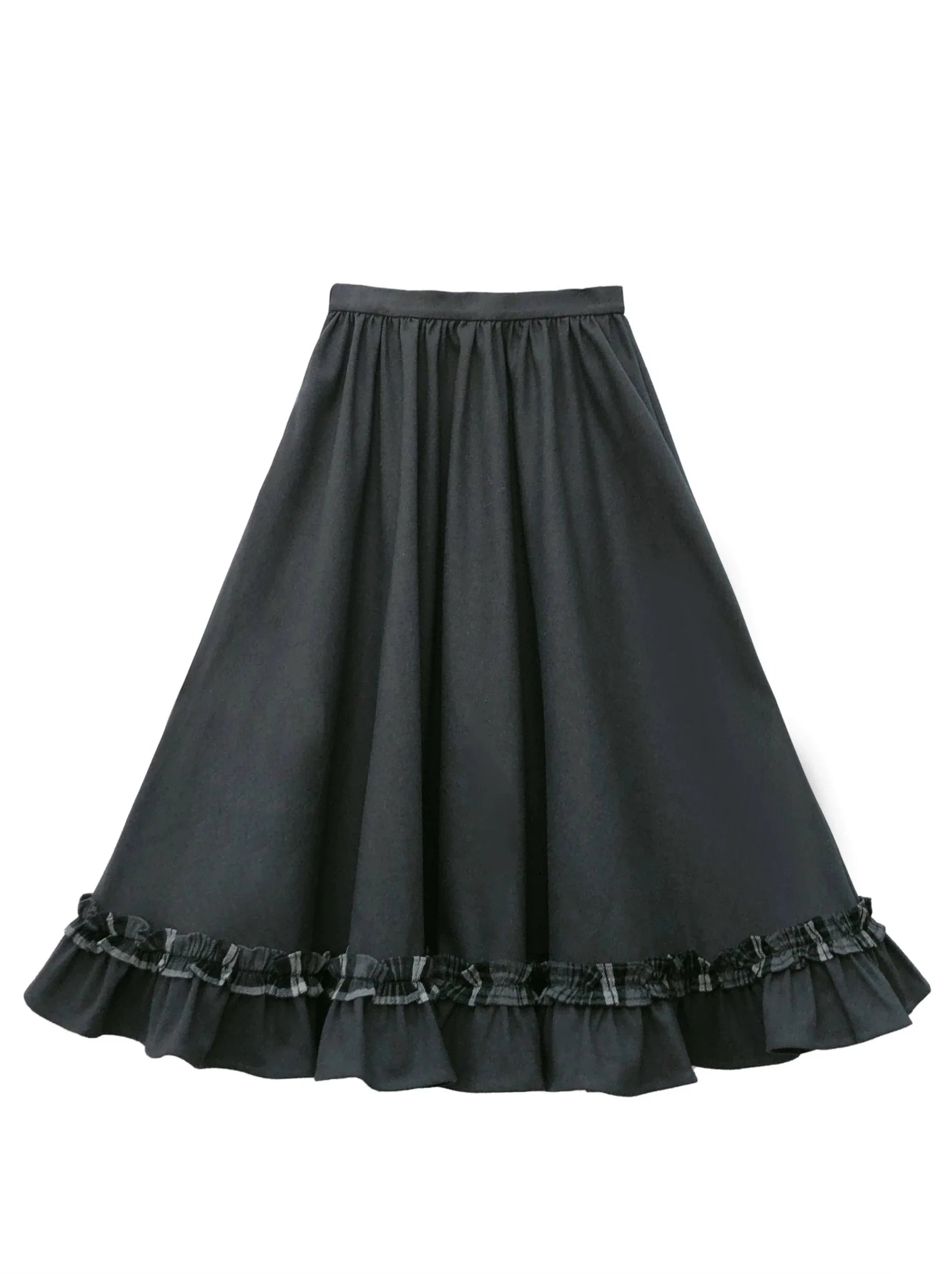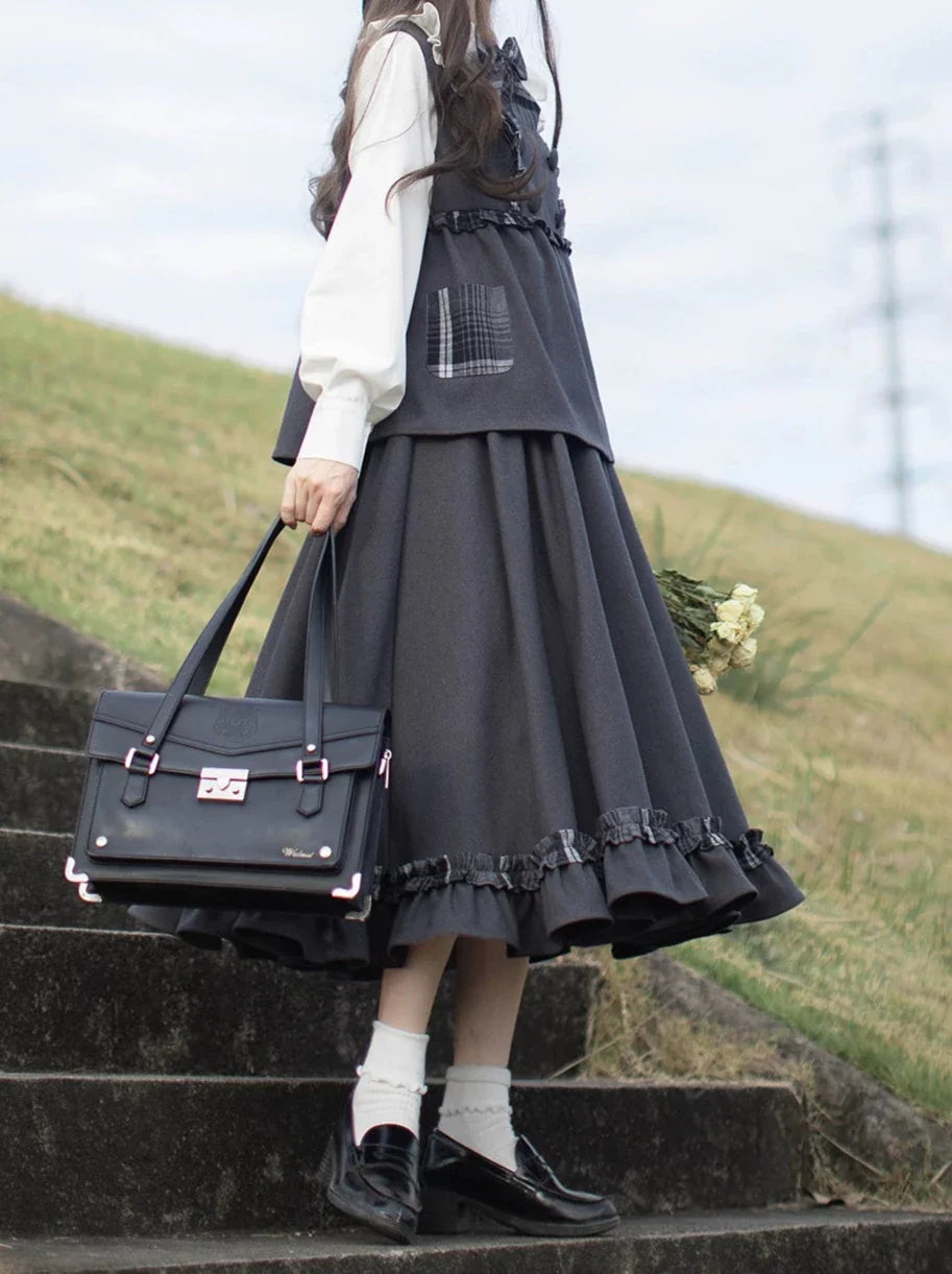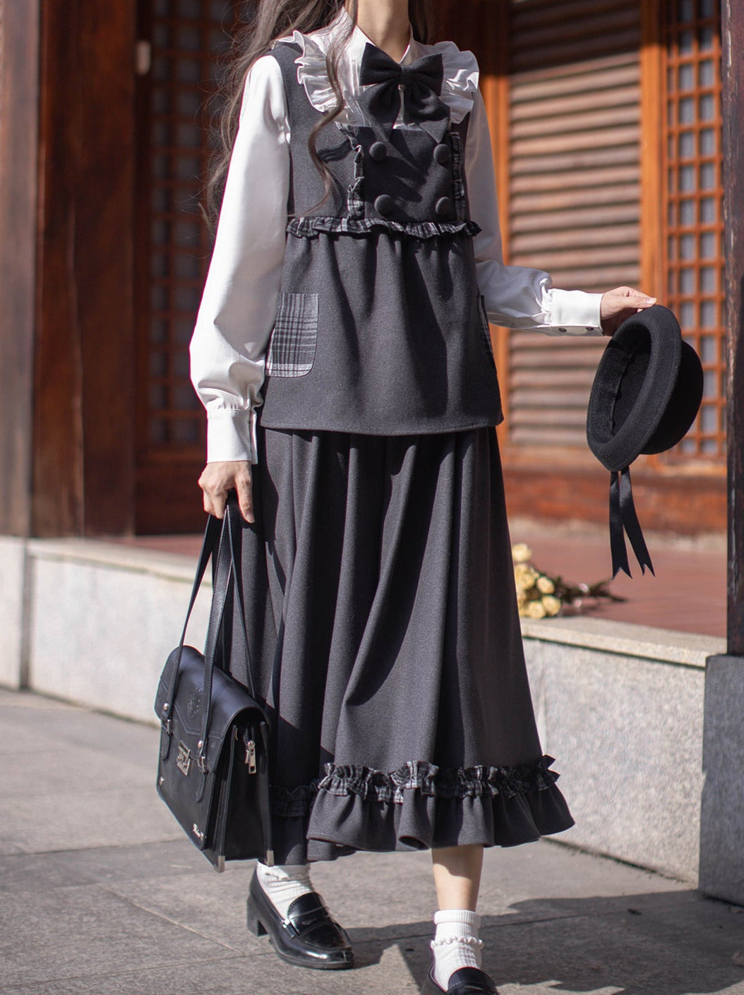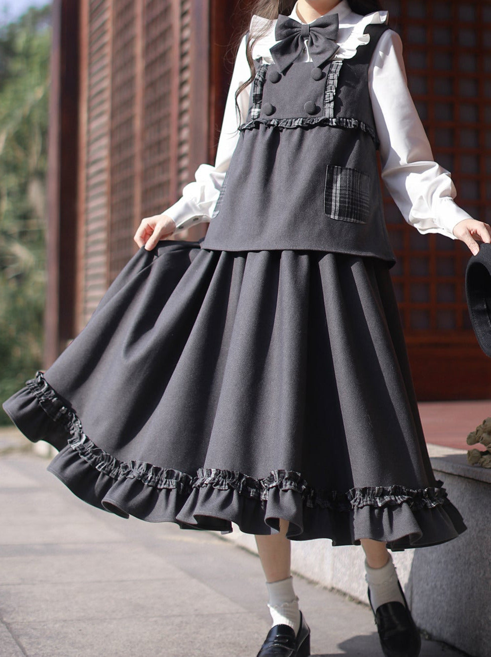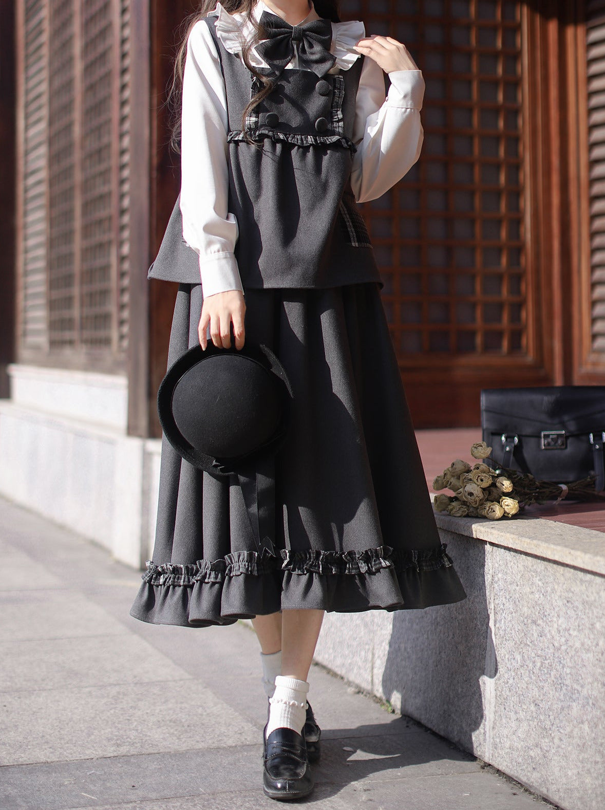 愛らしいラッフルスタイルのチェックスカートスーツは、チャーミングなリボンのディテールとクラシックな白いカレッジシャツが特徴です。フリルとベストがスタイルを格上げし、どんなシーンにもぴったりです。このオリジナルアンサンブルで、スタイリッシュでキュートな装いを演出しましょう。