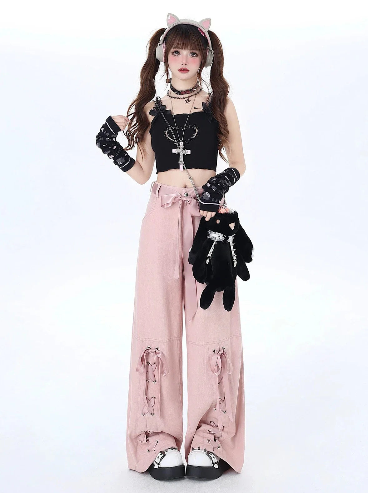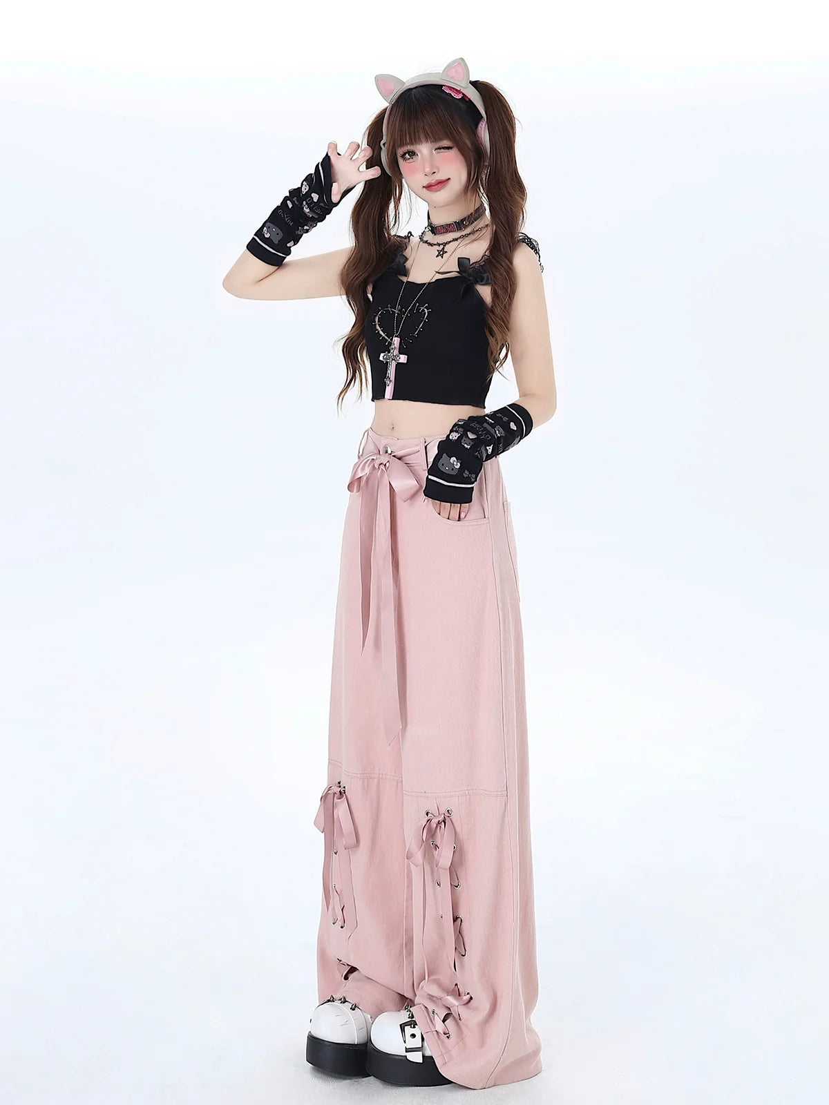サテンパンツ リボン レースアップ ルーズ
