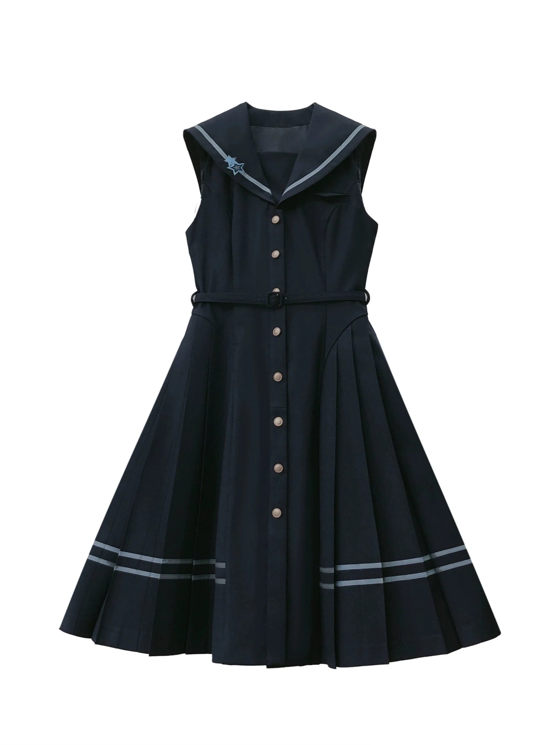 プリーツの入ったネイビーのスーツ地、ストライプのバッジ、そしてレトロなマジックデザインが特徴のキュートなシャツドレス。きっと注目を集める、愛らしくスタイリッシュな装いにぴったりです。