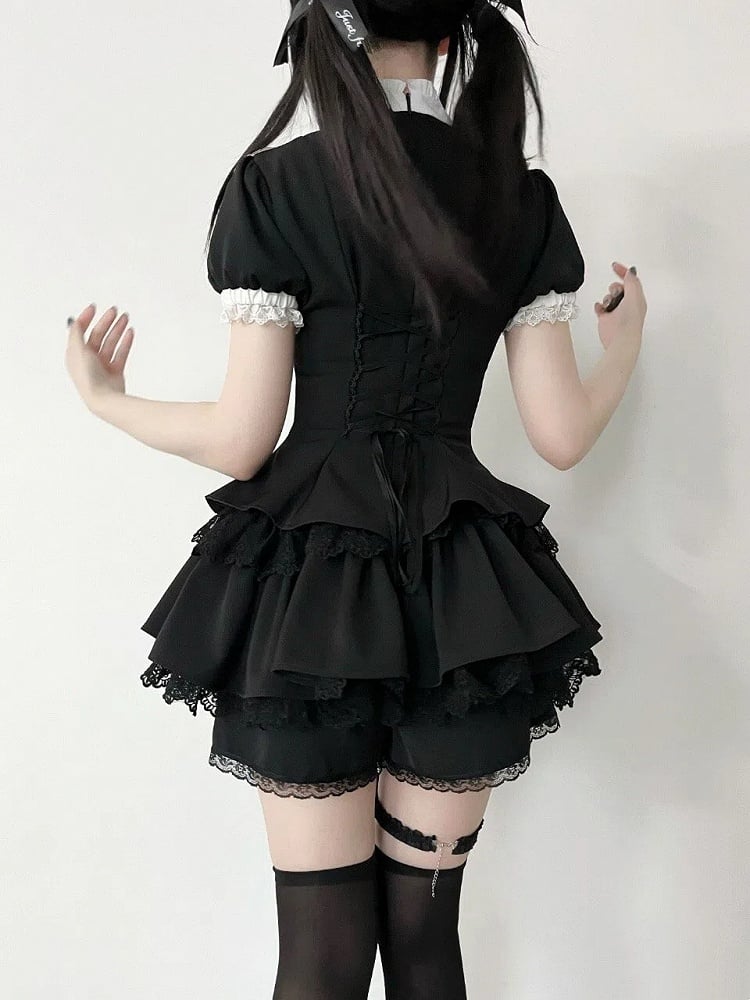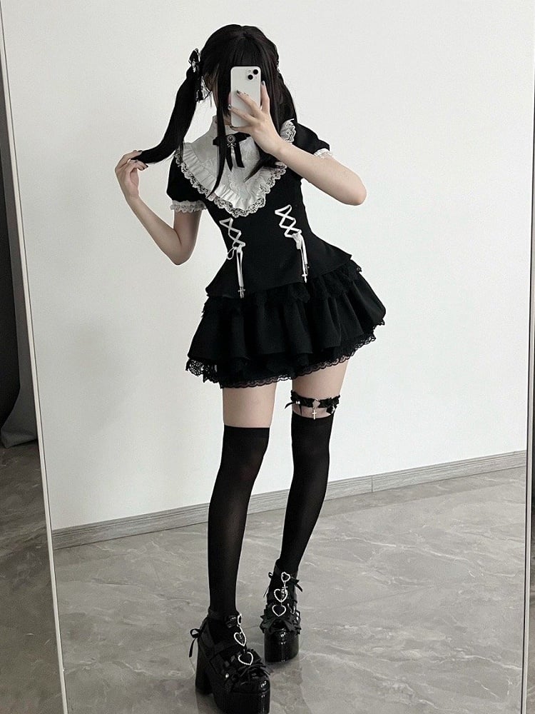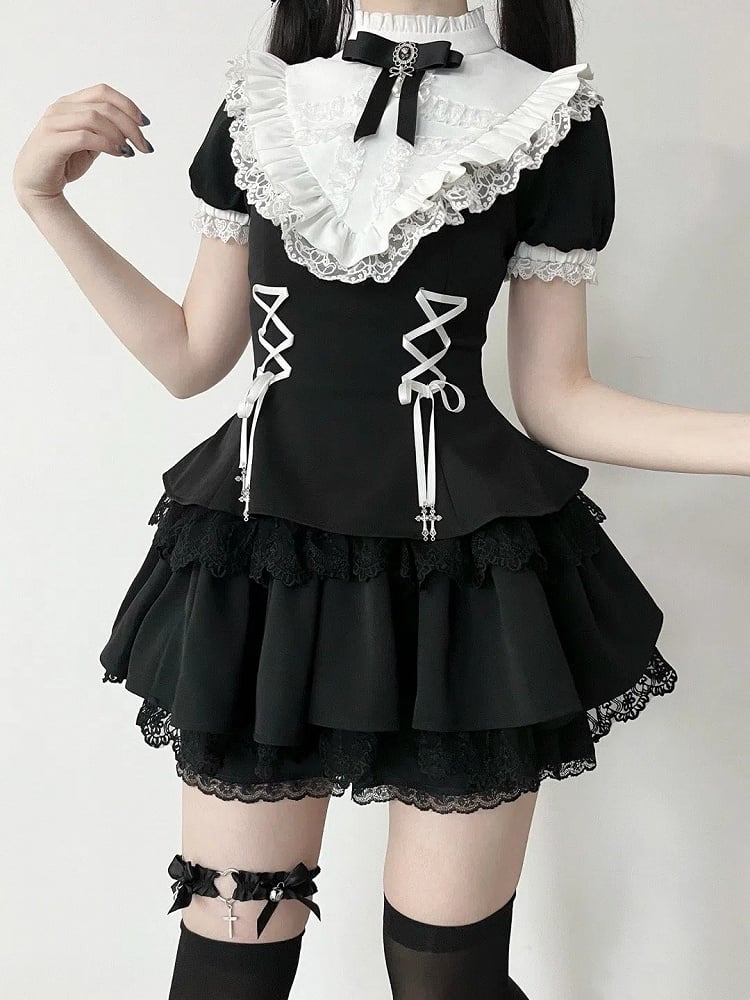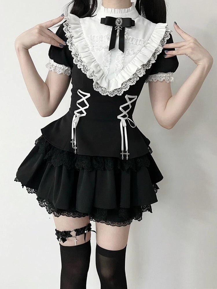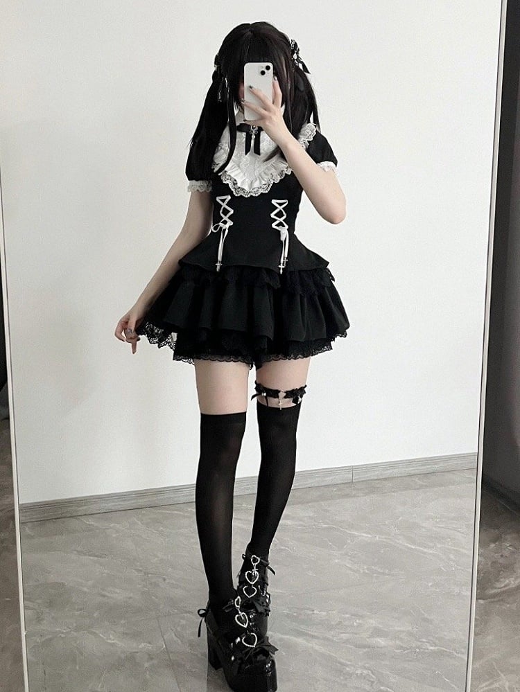 ショートフリルブラックスリーブホワイトネックラインゴシッククロスレースアップチャームドレスロリータ