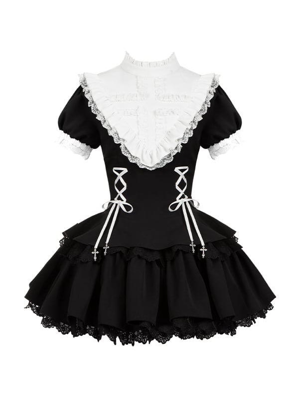 ホワイトのフリルネックライン、クロスチャーム、レースアップ、ブラックゴシックロリータ半袖ドレス