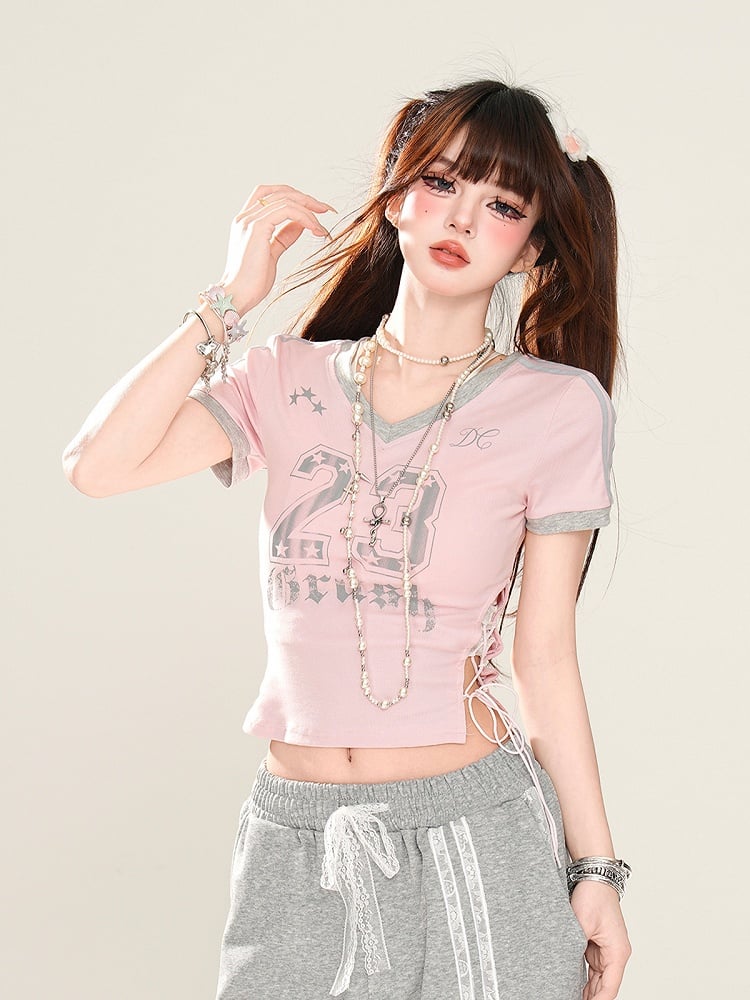 サイドにレースアッププリント、ピンクのVネックにナンバーディテールが入ったグラマラスなクロップドTシャツ