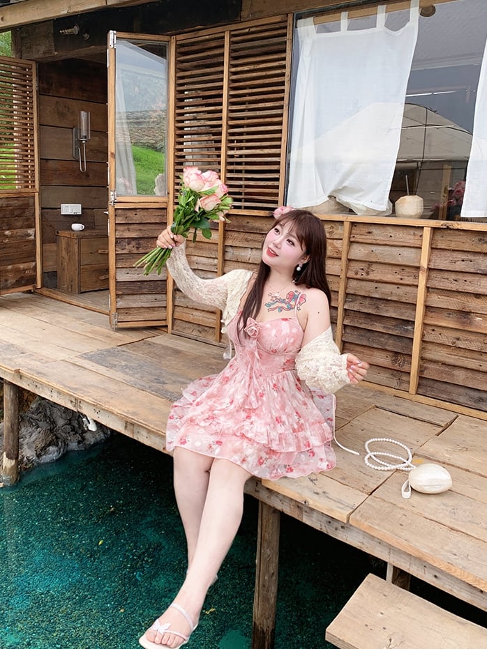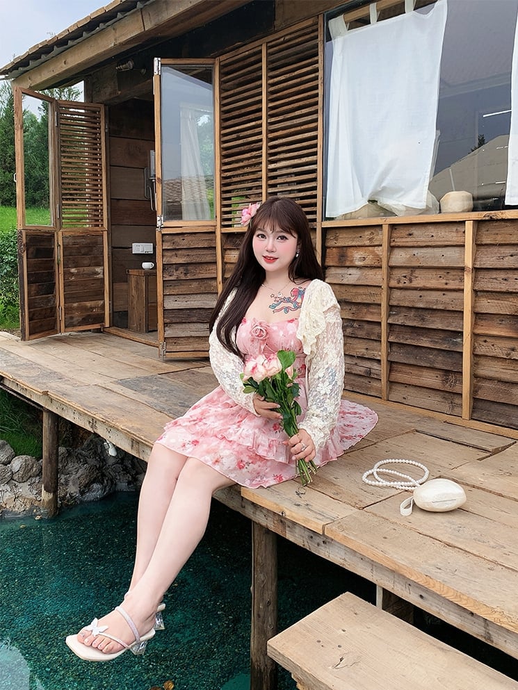 プラスサイズ バスクウエスト カスケードフリル ピンクロゼットプリント キャミワンピース ハイロースカート