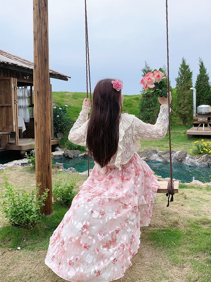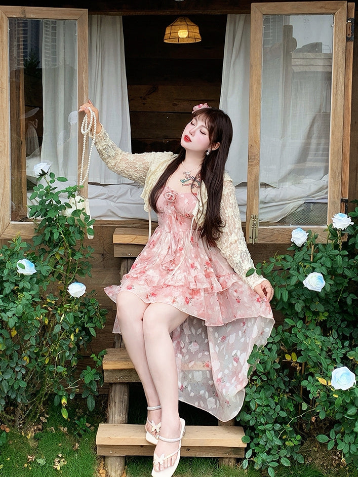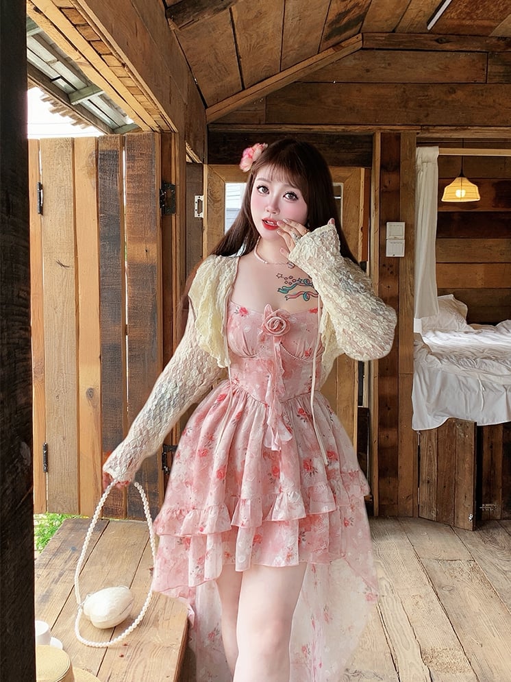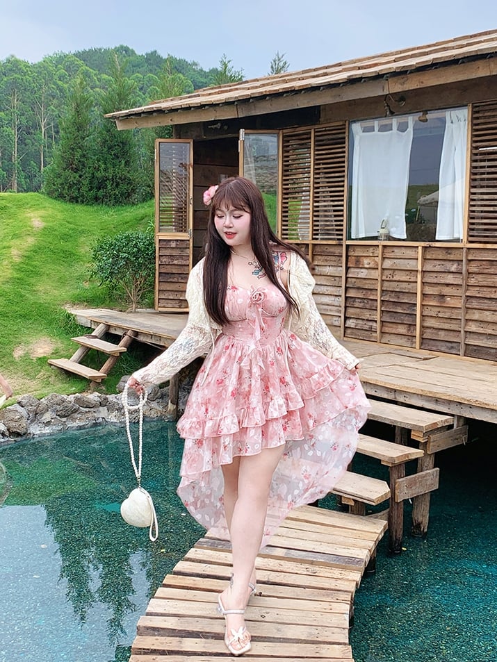 スカート ハイロー ロゼットプリント キャミソール ピンク ラッフル プラスサイズ バスクウエスト カスケードドレス