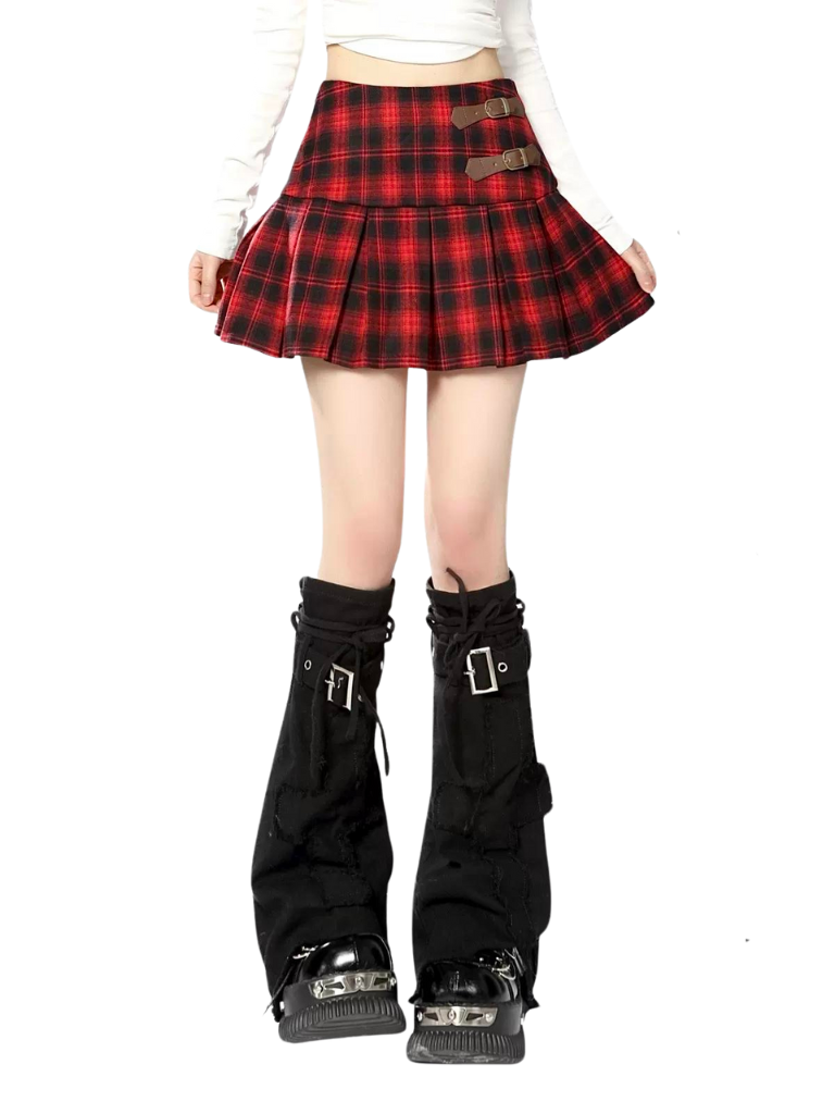 チェック柄、ダークレザー素材、プリーツデザインが特徴のキュートなパンク風スカート。バックルディテールでスタイルアップ効果も。エッジの効いた遊び心のあるルックにぴったりです。