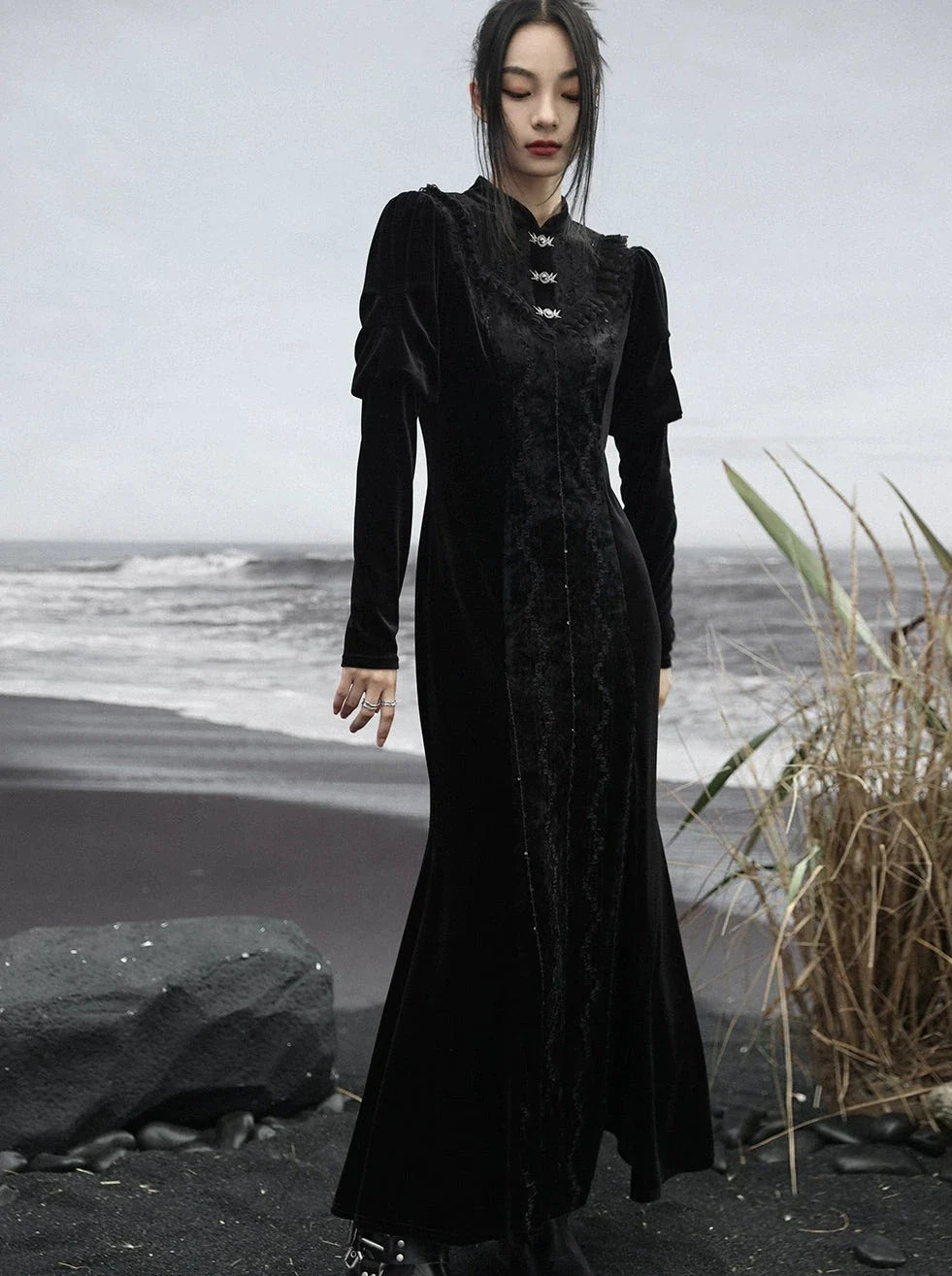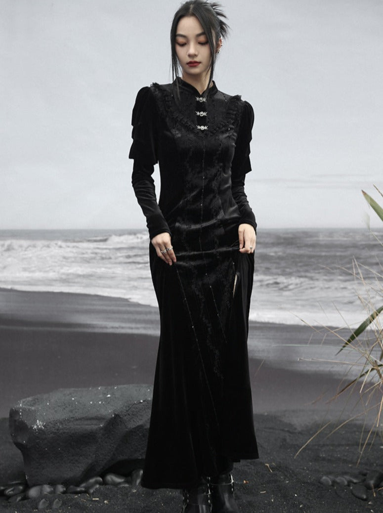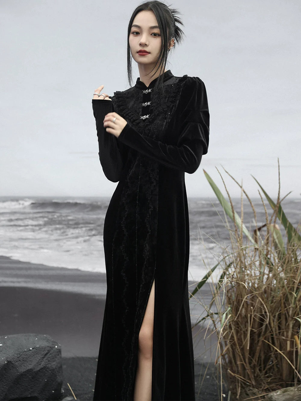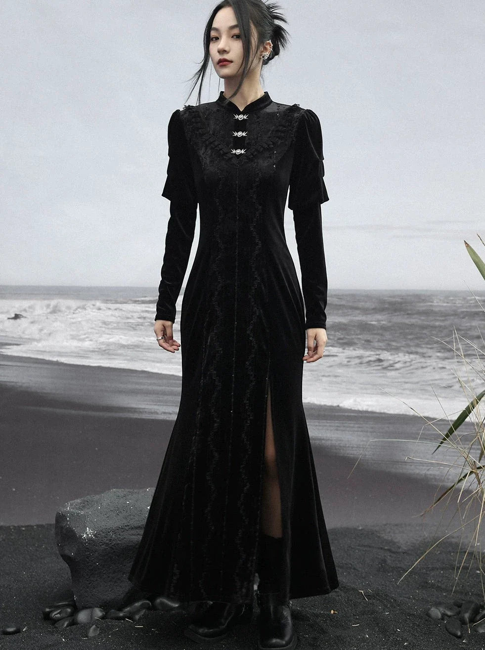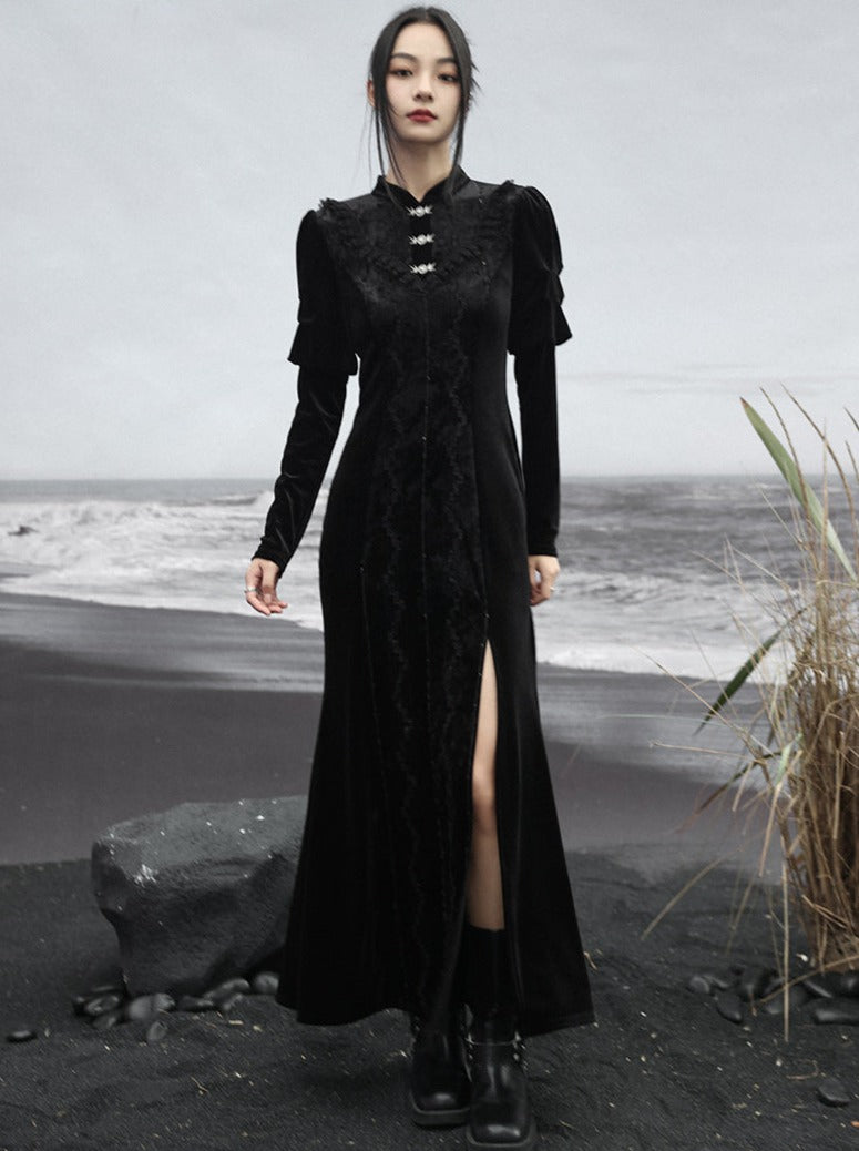 スカート レトロ スリット ロング ダーク レース スプライシング