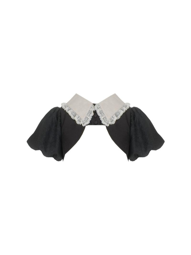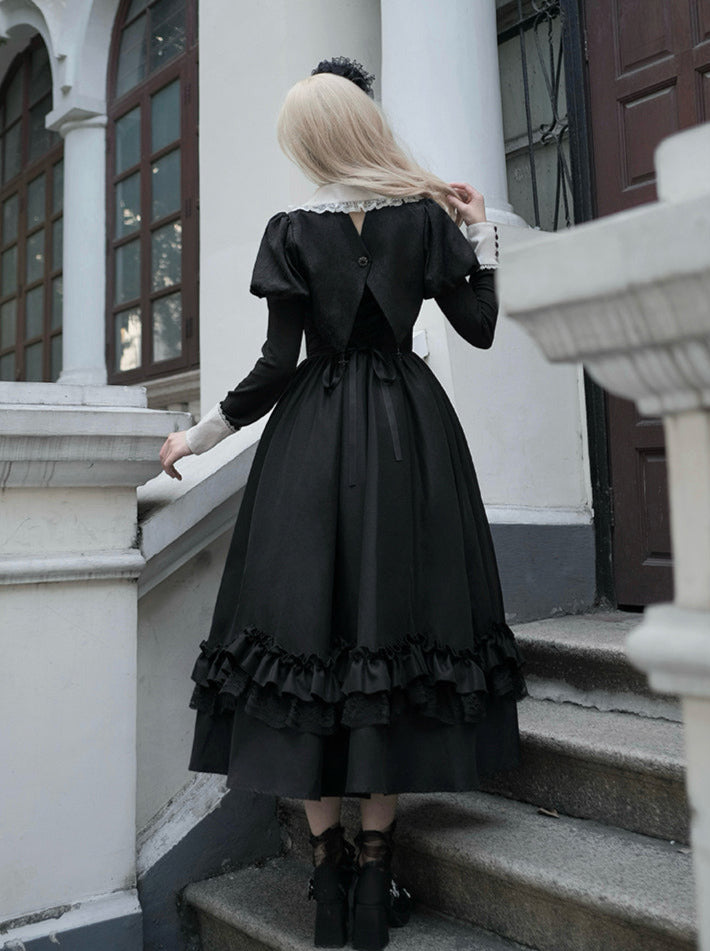 袖が美しく調和する、愛らしいジャケットドレス。夜のお出かけにぴったりです。ゴシック調のデザインで、ショート丈でもロング丈でも着られます。