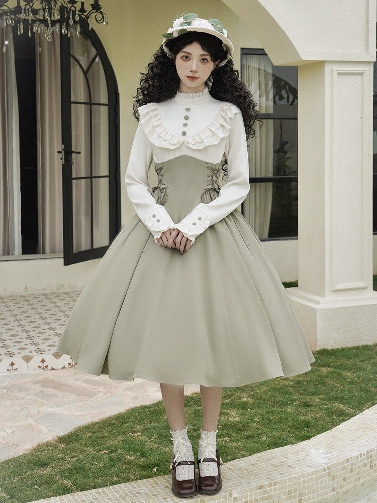 春の袖、フリルネックライン、フェイクロリータドレス、ライトグリーン、ロングデザイン、クラシックなツーピース、ベージュ
