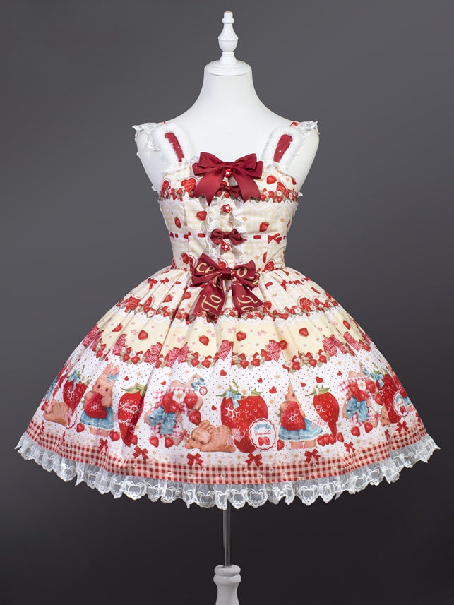 春のイチゴとウサギのリボンのアクセント、ウサギの耳のデザイン、黄色のロリータジャンパースカート