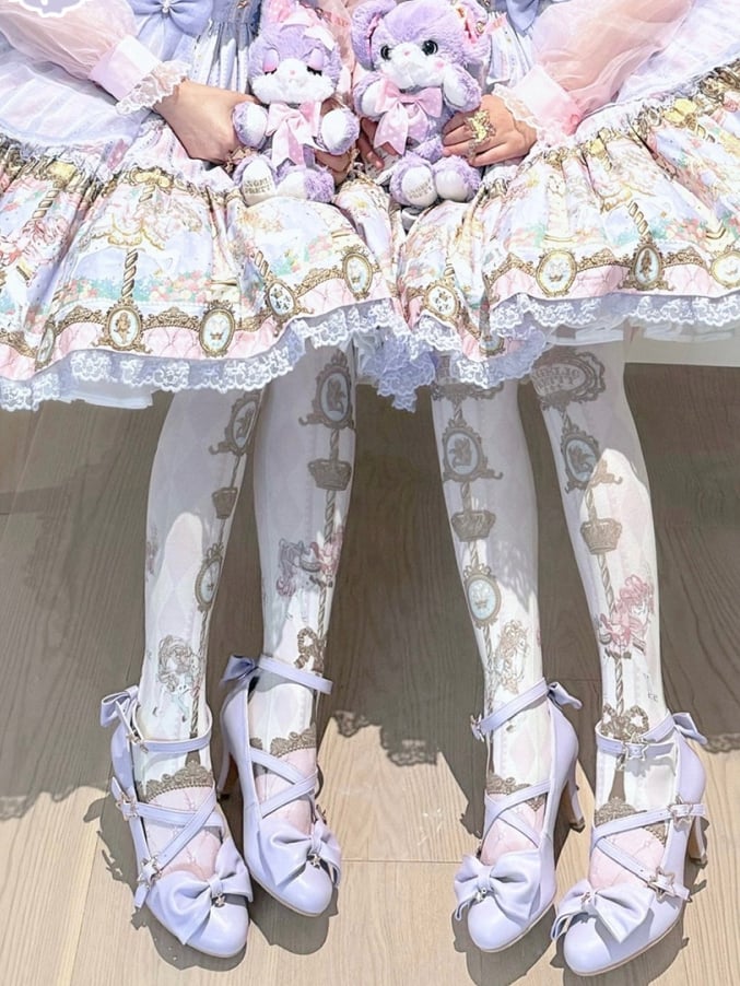 トップに紫のリボン、スターバックルストラップのハイヒール