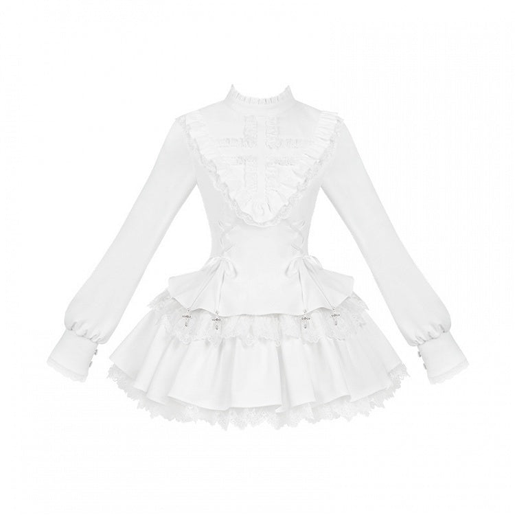 ホワイトのフリルネックライン、クロスチャーム、レースアップストラップ、ゴシックロリータドレス