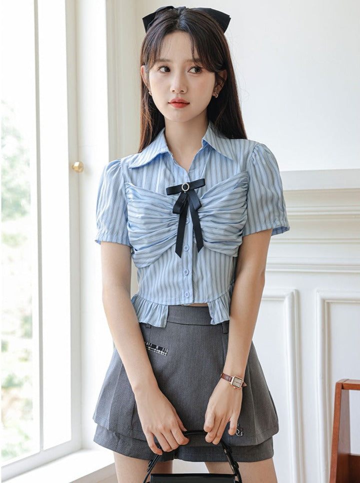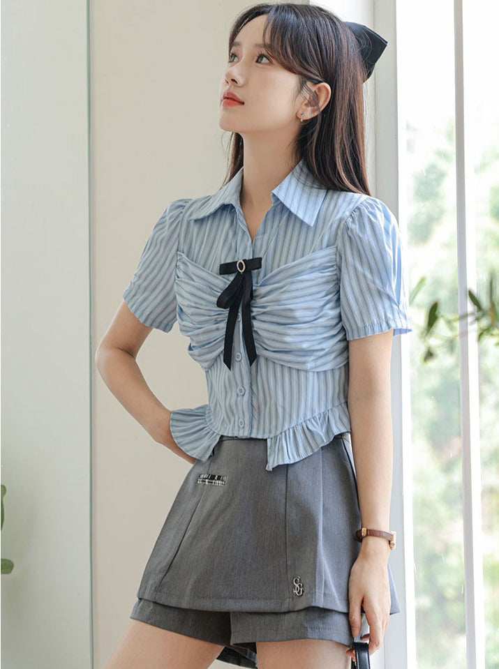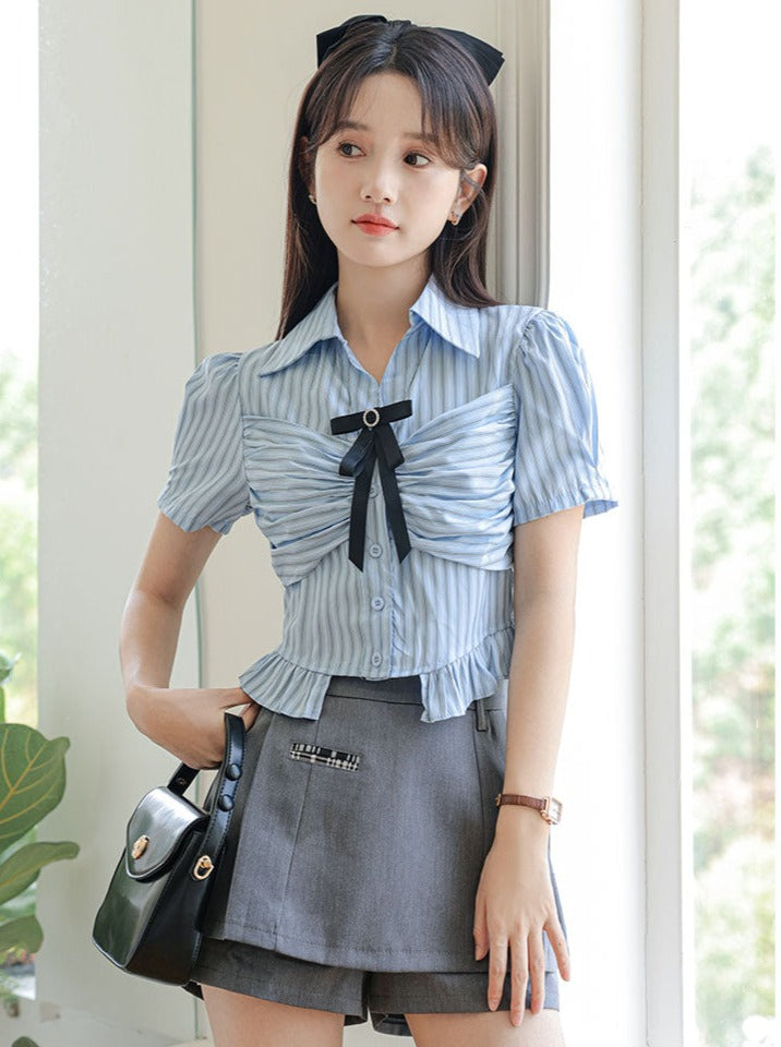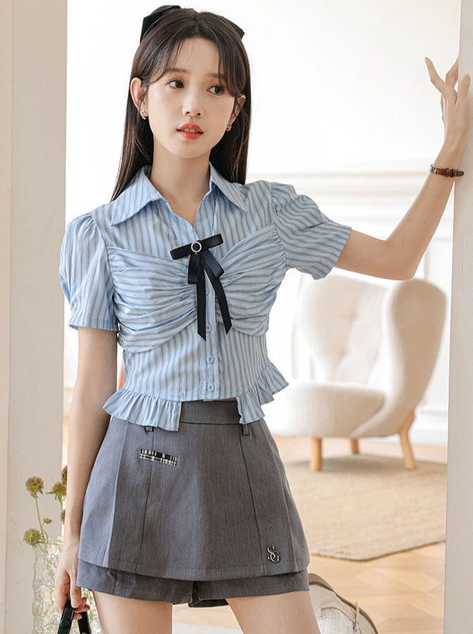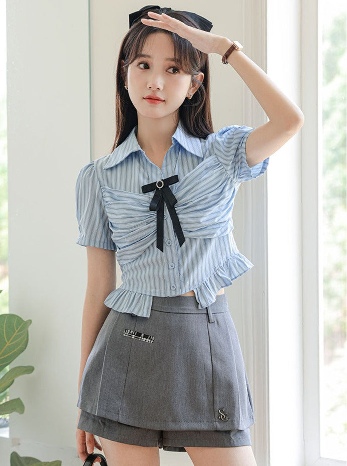 ストライプスカート ショートパンツ リボン ブルーブラウス