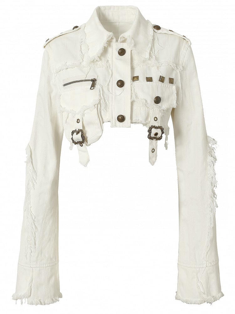 スタッズバックル装飾とウェイストランドクロップドホワイトパンクジャケット