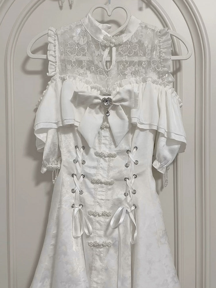 ホワイトチャイナドレス風ジライケイセット - イリュージョンネックラインミニドレス + ショートパンツ + 蝶ネクタイ + ベルスリーブ