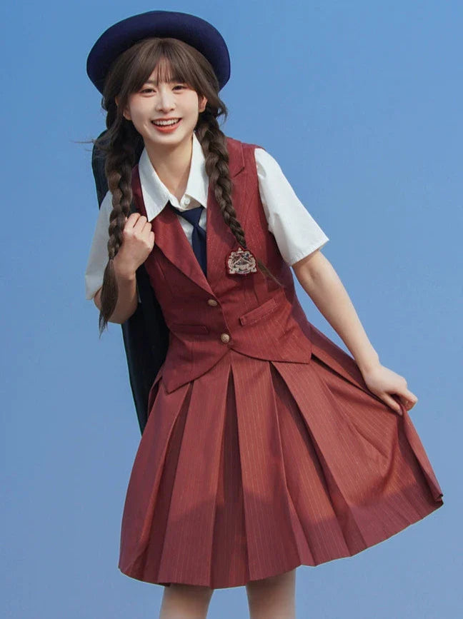 スタイルプリーツスカートカレッジベストで、ワードローブにキュートさをプラス!赤レンガとストライプ柄のベストは、個性的な雰囲気を求める大学生にぴったり。この可愛らしいベストで、快適でスタイリッシュな装いを演出しましょう。