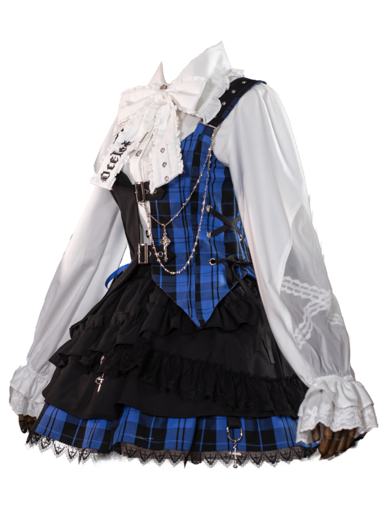 青と白のオールドスクールロリータファッションドレス 蝶結びディテール JSK セット