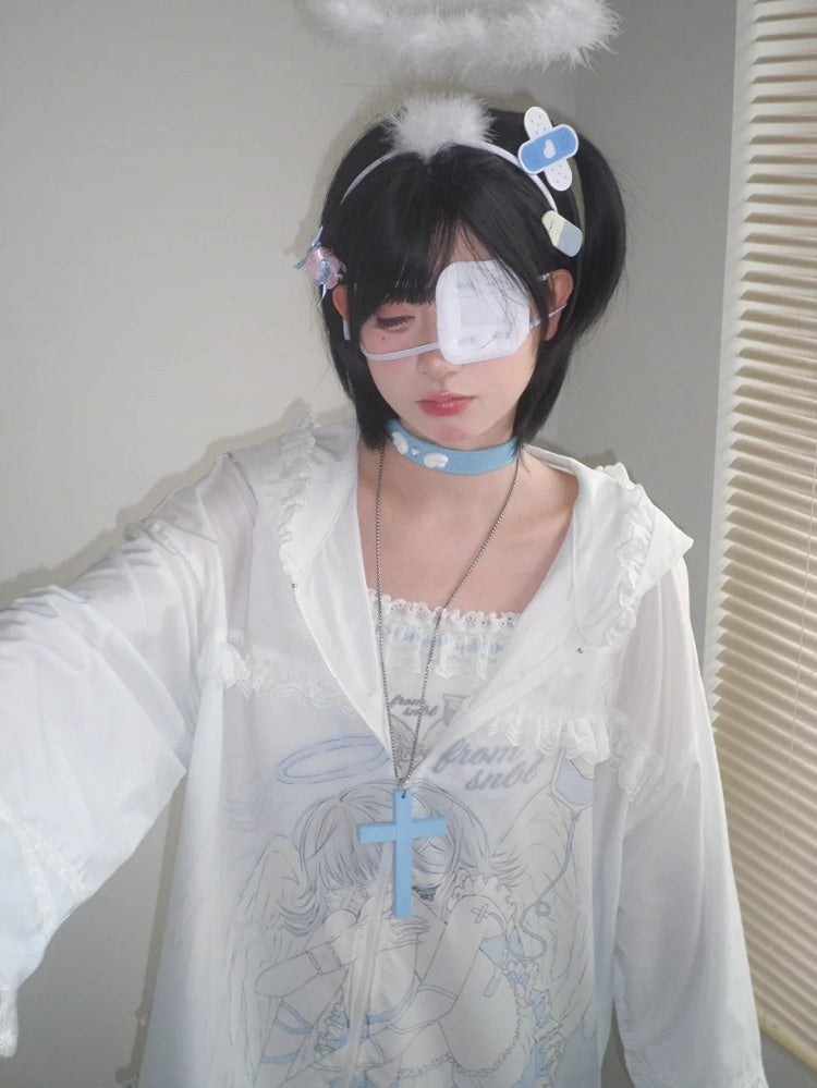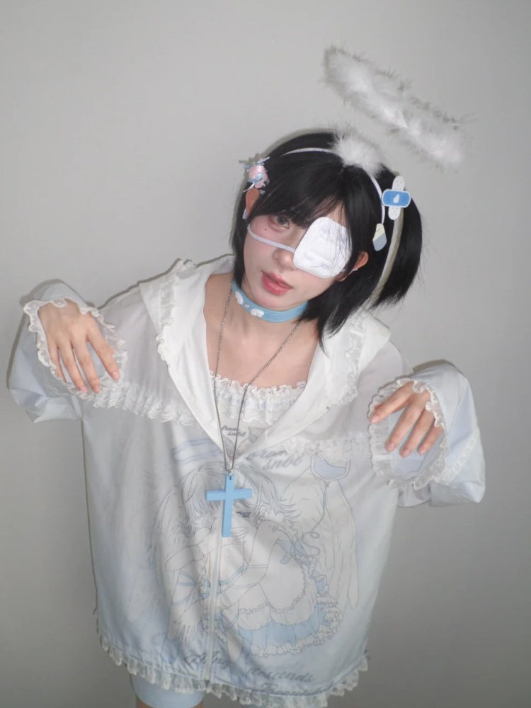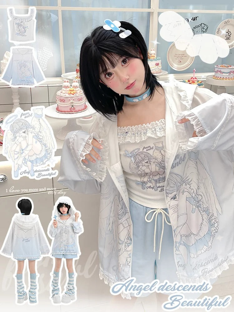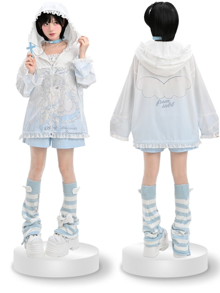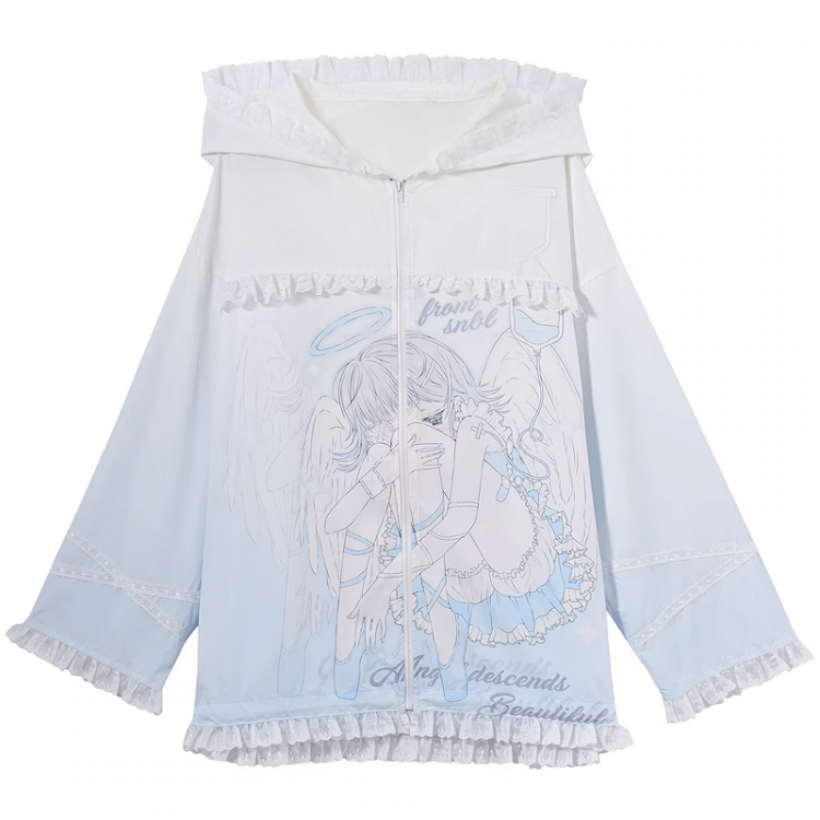 青と白のアニメガールプリント、フリルレース裾、日焼け防止フード付きジャケット