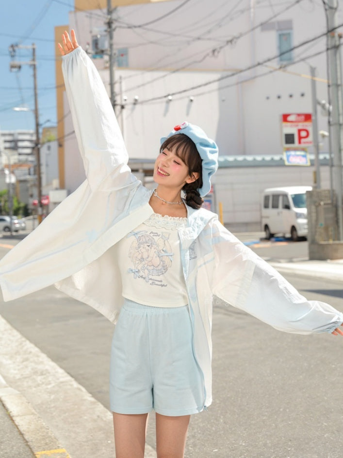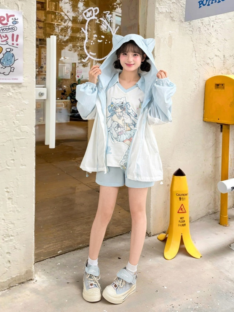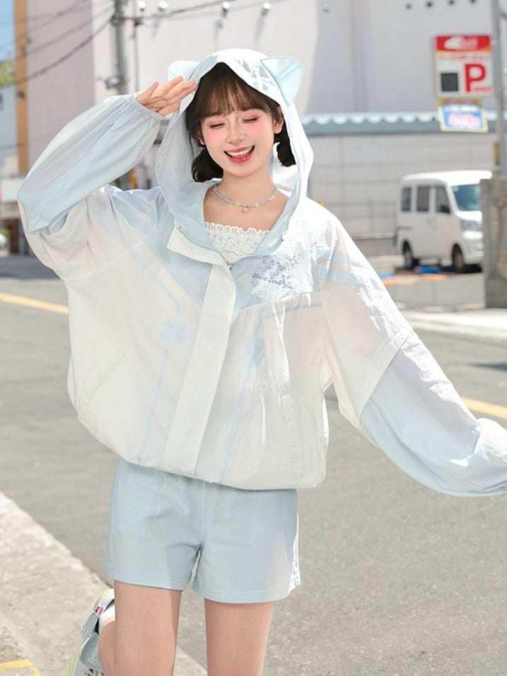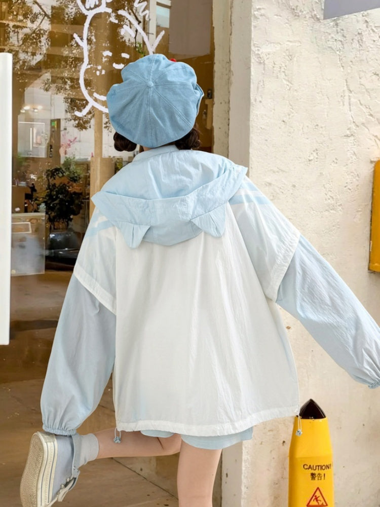 日焼け防止ジャケット 裾フード 猫耳 ブルーカラーブロックデザイン ドローストリングデザイン