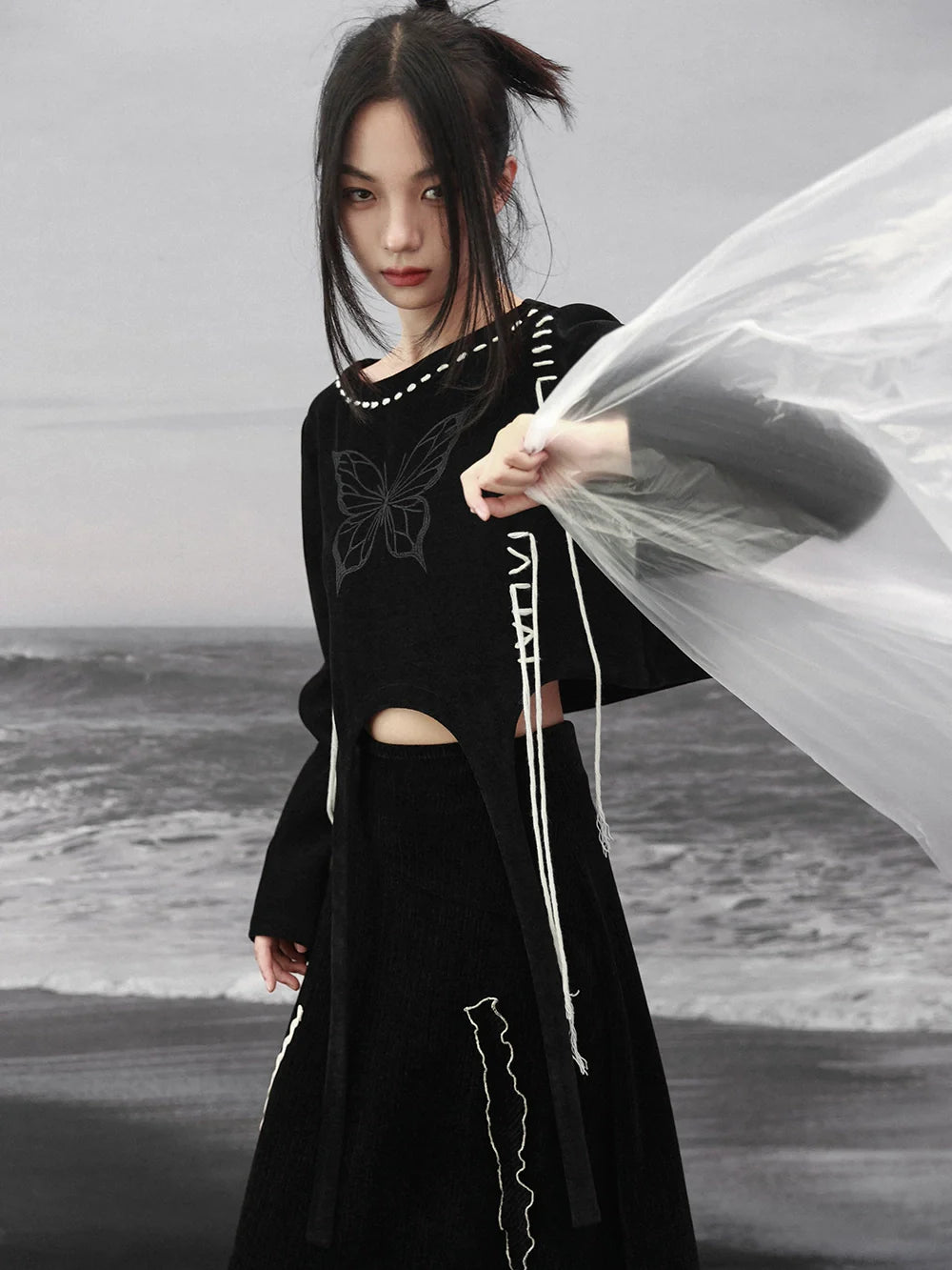 ショート丈のバタフライデザインとスタイリッシュなストラップディテールが特徴の、愛らしいブラックのスウェットシャツ。このユニークで快適なトップスを着て、暖かく、さりげなく愛らしい装いを演出しましょう。