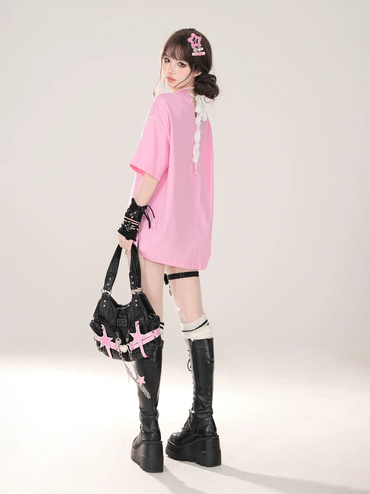 ピンクと白のオールドスクールロリータファッションドレス、蝶結びディテール、ロリータJSKセット